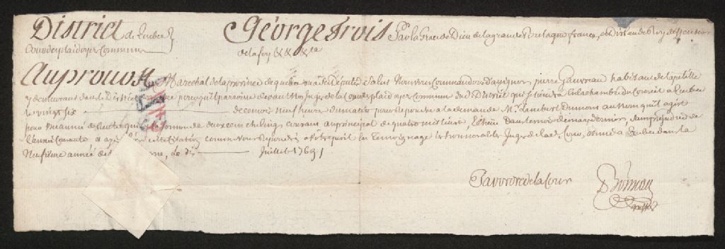 Procès entre le nommé [Eustache] Lambert Dumont, d'une part, et Pierre Gauvreau, demeurant à Québec, d'autre part, à propos d'une somme de 200 shillings courant, 10 juillet 1769, Archives nationales à Québec, Fonds Cour des plaidoyers communs, (03Q,TP5,S1,SS1,D772).