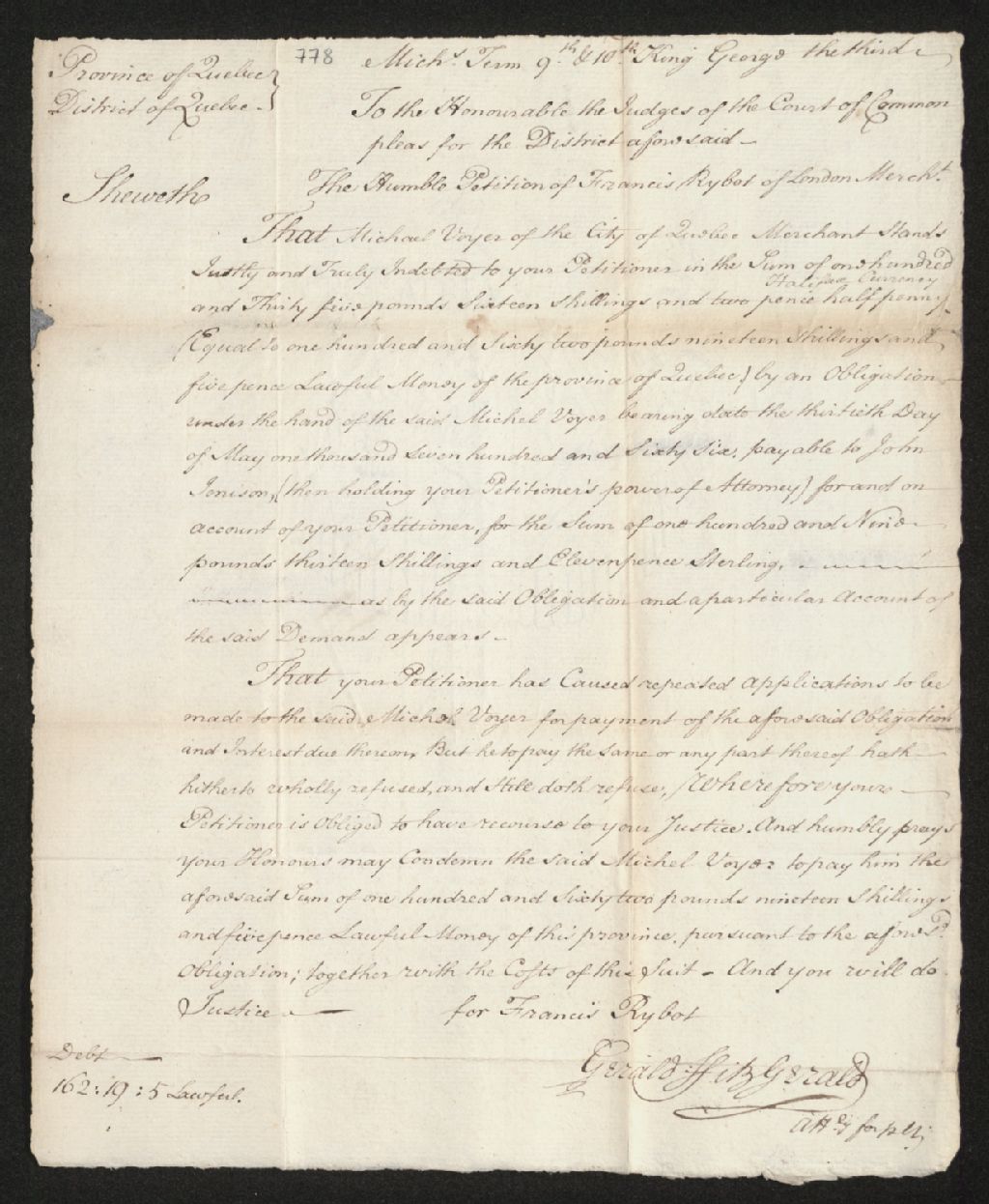 - Procès entre Francis Rybot, marchand de Londres, d'une part, et Michel Voyer, marchand demeurant à Québec, d'autre part, à propos d'une somme de 135 livres, 16 shillings, 2 pence et un demi penny d'Halifax, l'équivalent de 162 livres, 19 shillings et 5 pence courant contenue dans une obligation