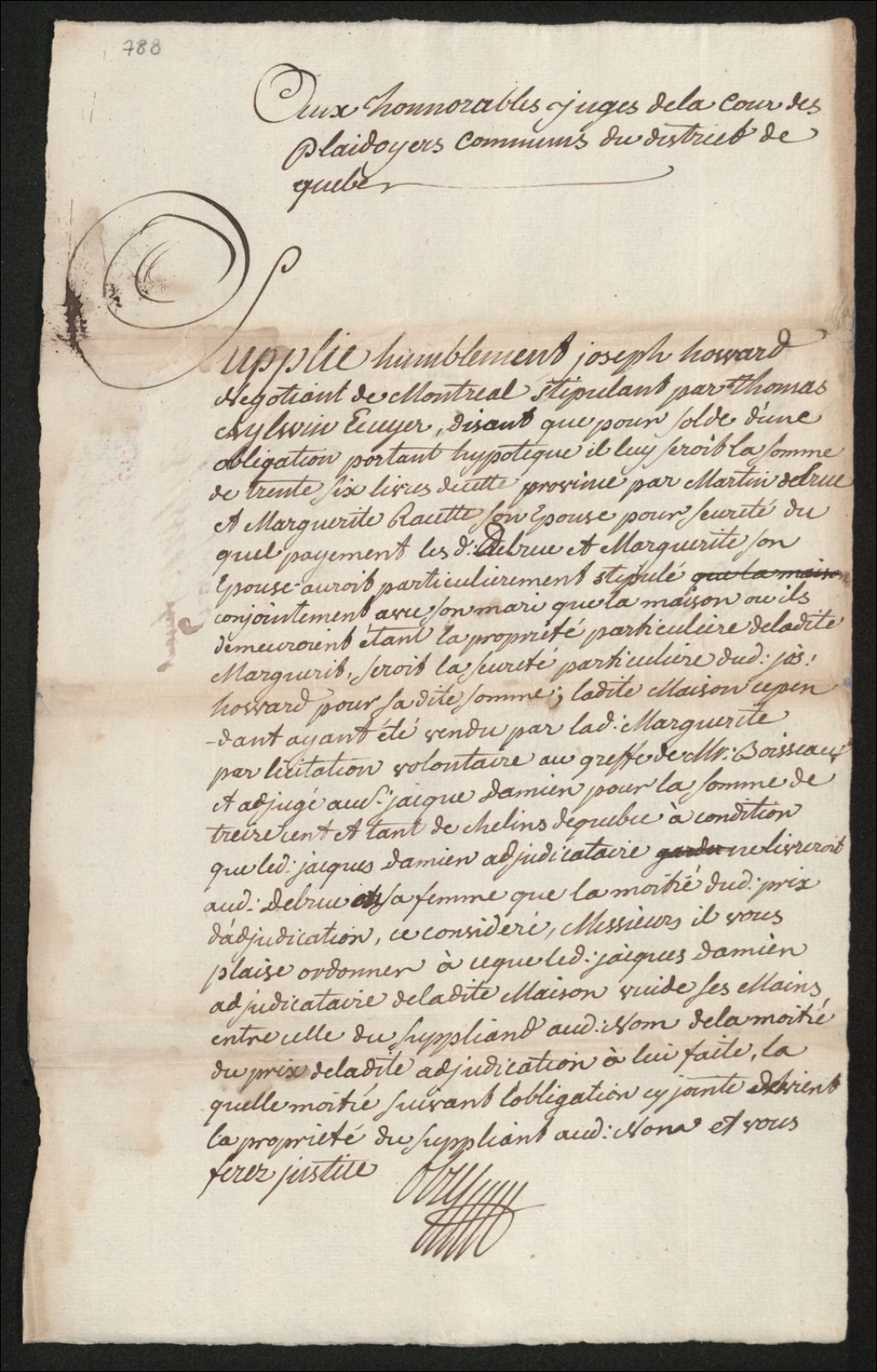 Procès entre Joseph Howard, négociant de Montréal, stipulant par Thomas Aylwin, écuyer, d'une part, et Martin Delru dit Hartois (Artois), maître tailleur d'habits, et Marguerite Racet (Racette), sa femme, veuve en premières noces de Joseph Roza, d'autre part, à propos d'une somme de 36 livres courant contenue dans une obligation