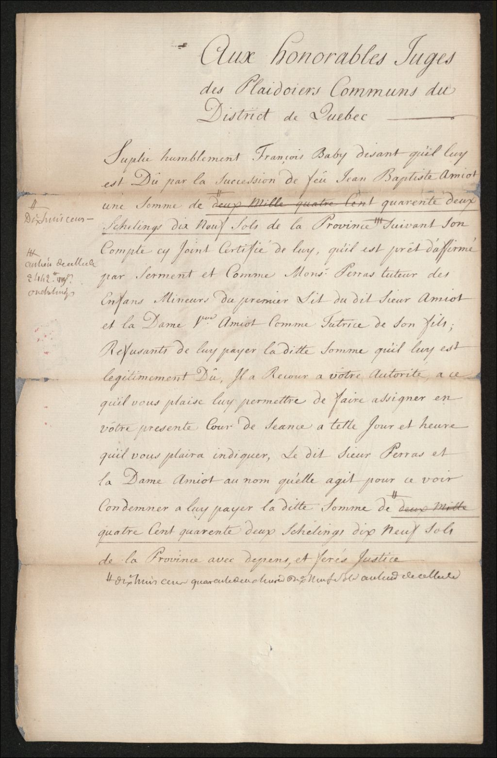 - Ce dossier en matières civiles provient de la Cour des plaidoyers communs. Il comprend une requête de François Baby réclamant 1842 shillings et 19 sols courant et un mandat d'assignation (warrant) à la dame veuve Amiot et au sieur Perras