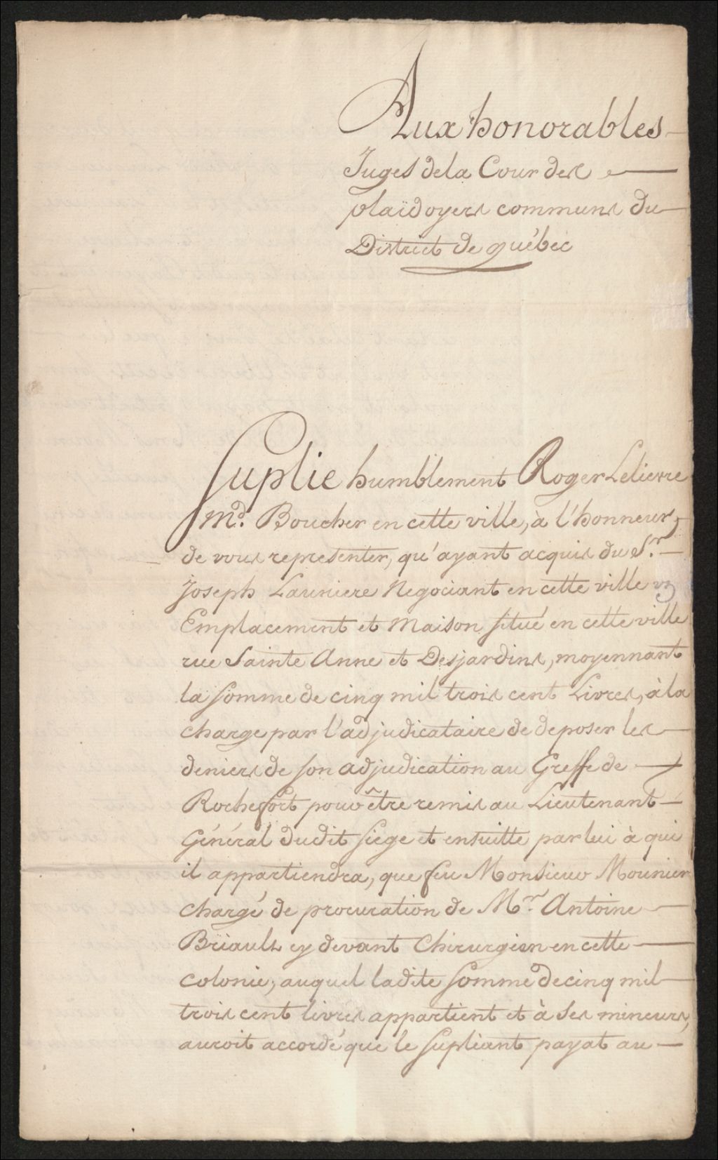 - Procès entre Roger Lelièvre, marchand boucher demeurant à Québec, d'une part, et Thomas Lée, associé du feu sieur Mounier (Monier), chargé de procuration d'Antoine Briauls (Briault), chirurgien, et Joseph Launière, négociant demeurant à Québec, d'autre part, à propos 5200 shillings pour le paiement des emplacements et de la maison sise sur la rue Sainte-Anne et la rue Desjardins à Québec