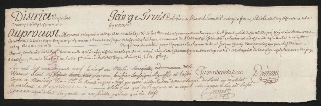 Ce dossier en matières civiles provient de la Cour des plaidoyers communs. Il comprend un mandat d'assignation (warrant) à Jean-Baptiste Lecompte Dupré et un exploit d'assignation en conséquence