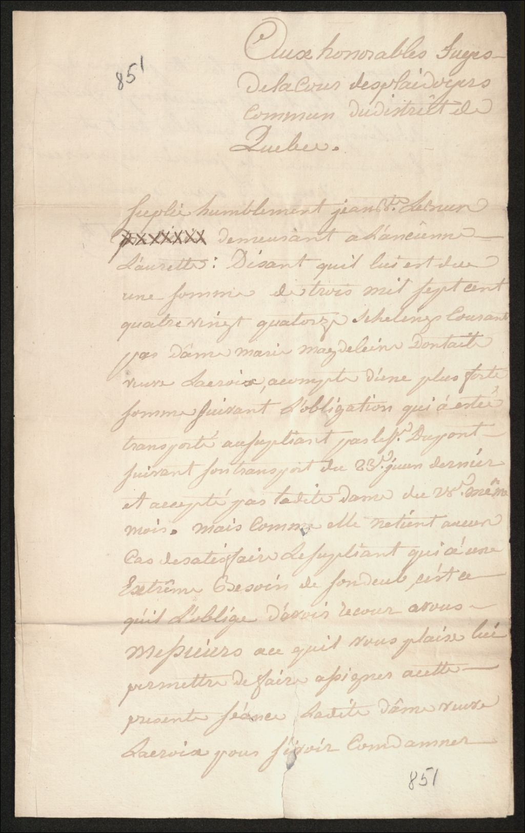 - Procès entre Jean-Baptiste Lebrun, demeurant à l'Ancienne-Lorette, d'une part, et Marie-Madeleine Dontail, veuve de Joseph Lacroix, demeurant à Québec, d'autre part, à propos d'une somme de 3794 shillings courant contenue dans une obligation