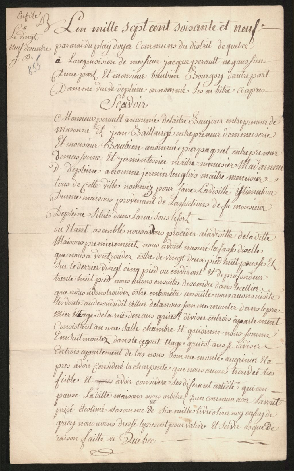 Procès entre Jacques Perrault, négociant de Québec demeurant rue du Sault-au-Matelot, au nom et comme fondé de la procuration des héritiers Monbrun, d'une part, et la veuve Deplaine (De Plaine, des Plaines) et le sieur Desaunier (Desaulniers) Beaubien, bourgeois demeurant rue Saint-Pierre à Québec, en tant qu'exécuteur testamentaire et comme héritier et procureur des héritiers du défunt sieur Deplaine, d'autre part, à propos de l'homologation du procès-verbal d'estimation de la maison dudit feu sieur Deplaine sise rue Sous-le-Fort à Québec, qui a été ordonnée en vertu d'un arrêt rendu par la Cour des plaidoyers communs le 4 décembre dernier, afin que les défendeurs procèdent au paiement de la somme de 3000 livres tournois issue de la succession en question auquel ils ont déjà été condamnés, 29 novembre 1769 - 26 janvier 1770, Archives nationales à Québec, Fonds Cour des plaidoyers communs, (03Q,TP5,S1,SS1,D855).