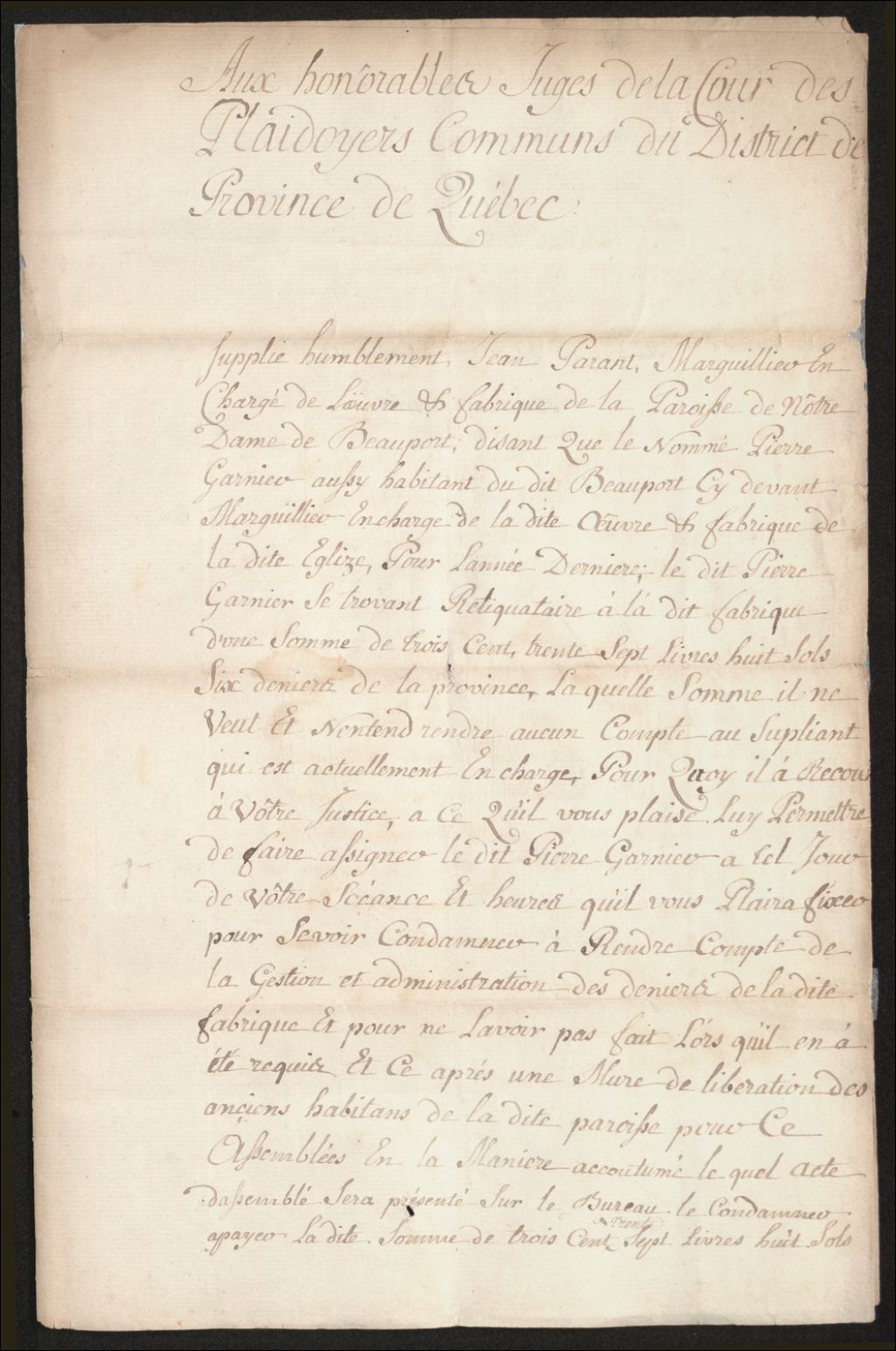 Procès entre Jean Parant (Parent), marguillier en charge de l'oeuvre et de la fabrique de la paroisse de Notre-Dame de Beauport, d'une part, et Pierre Garnier, habitant de Beauport, marguillier en charge de l'oeuvre et de la fabrique de l'église de ladite paroisse pour l'année dernière, d'autre part, à propos de la somme de 337 livres, 8 sols et 6 deniers en argent courant dont ledit Garnier se trouve reliquataire, refusant de rendre compte de la gestion et de l'administration des deniers de la fabrique en question, 4 avril 1770 - 24 avril 1770, Archives nationales à Québec, Fonds Cour des plaidoyers communs, (03Q,TP5,S1,SS1,D873).