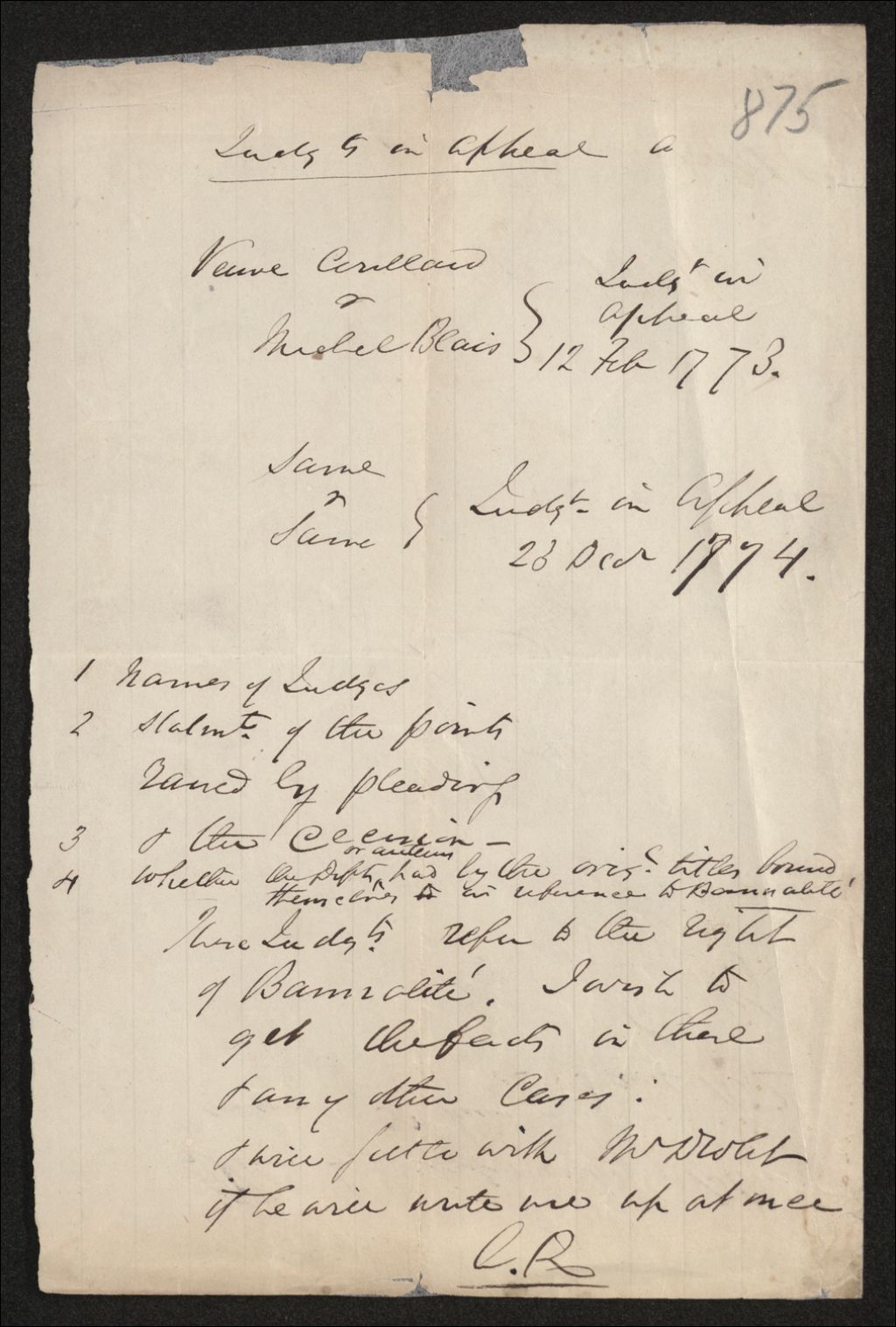 - Ce dossier en matières civiles provient de la Cour des plaidoyers communs. Il comprend une requête de Geneviève Alliez, réclamant que les habitants de la seigneurie de la Rivière-du-Sud paient leurs droits de mouture, un acte de partage et un acte de transaction du 12 mars 1736 fait par maître Abel Michon, notaire royal de la Côte-du-Sud, concernant les moulins de la seigneurie, entre Jacques Couillard, sieur Despré (Després), demeurant à la paroisse Saint-Thomas à la Rivière-du-Sud (Pointe-à-la-Caille), et Louis Couillard, seigneur de ladite seigneurie de la Rivière-du-Sud, tous deux héritiers de feu Jean-Baptiste Couillard, écuyer, sieur Delespinay (Lespinay, Lépinay, L¿Épiné, L¿Espinay), conseiller du Roi et son lieutenant général civil et criminel, une transcription de l'acte de partage du 22 juin 1740 passé entre Jacques Couillard, fils aîné, Joseph Couillard, Clément Couillard, François Chaurel (Chorel) Dorvillier (Dorvilliers), au nom et comme ayant épousé Marie Couillard, Pierre Bellanger (Bélanger), au nom et comme ayant épousé Marthe Couillard, Élisabeth Couillard, épouse de Bernard Damour (Damours), écuyer, sieur Deplaine (De Plaine, des Plaines), le sieur Beaumont, au nom et comme ayant épousé Madeleine Couillard, le sieur de Courberon, au nom et comme ayant épousé Angélique Couillard, tous enfants et héritiers de feu Jacques Couillard Despré et Élisabeth Lemieux, leur père et mère, une transcription d'un second acte de partage entre lesdits héritiers Couillard du 29 octobre 1742, un extrait du registre de la Cour des plaidoyers communs qui ordonne que les écrits des défendeurs soient communiqués à la demanderesse alors que la cause est remise au premier Conseil, un écrit de défense fourni par Michel Blais père, avec mention de la quittance du droit de quint payé au receveur général des droits de Sa Majesté, d'un acte d'aveu et de dénombrement et du droit de banalité, un mémoire instructif présenté par la veuve Couillard, expliquant que les défendeurs ne peuvent construire un moulin banal sur leur partie de seigneurie, n'ayant point le droit de banalité revenant uniquement au seigneur primitif, un écrit de réponse de Michel Blais, père et fils, et de Simon Fournier, par lequel ils affirment être seigneurs à part entière de leurs potions de seigneurie en ayant ainsi le droit de banalité sans avoir à rendre foi et hommage à ladite Alliez, relevant directement de Sa Majesté, deux copies d'un extrait du jugement de la Cour qui condamne Michel Blais père et consorts à payer les moutures des grains d'une année de la consommation de leurs familles, deux exploits de signification de sentence aux défendeurs, une requête de Geneviève Alliez, réclamant que les défendeurs ne s'étant conformé à la sentence rendue le 14 août 1770 soient condamnés à payer 100 shillings d'amende en argent courant, un exploit de signification de requête aux défendeurs, une réplique de Michel Blais, père et fils, par laquelle ils reconnaissent le droit de banalité de la veuve Couillard seulement dans sa partie de seigneurie, une réplique d'Antoine Gervais et de Laurent Cloutier qui déclarent n'être point les censitaires de la dame veuve mais bien ceux de Jacques Couillard Despré, avec mention de l'ouvrage de [Claude-Joseph de] Ferrière, un écrit de Michel Blais et consorts pour tenter de convaincre la Cour de revenir sur le jugement rendu après la soumission d'une nouvelle pièce, un écrit de la dame Couillard déclarant que le contrat soumis par les défendeurs a déjà été représenté aux juges et qu'il ne peut donc porter atteinte à la sentence rendue, un exploit de signification de l'écrit de ladite dame Couillard aux défendeurs, un extrait d'un jugement de la Cour qui ordonne que ladite sentence du 14 août 1770 sera exécutée selon sa forme et teneur, une requête de Geneviève Alliez, au nom de son fils mineur, seigneur primitif de la Rivière-du-Sud, réclamant que Michel Blais fasse démolir à ses frais un moulin à farine à vent qu'il a fait construire malgré la sentence rendue qui a été confirmée par la Cour du Banc du Roi le 12 février 1773, un mandat d'assignation audit Michel Blais, un écrit de désistement des autres coseigneurs dans l'action intentée pour obtenir la démolition dudit moulin construit par le sieur Blais, une réplique de Geneviève Alliez expliquant que la banalité du moulin à vent sur la portion dudit Couillard Despré n'est pas divisée par la transaction de 1736, avec mention de la Coutume de Paris, une défense de Simon Fournier, fils de Jean Fournier, une défense de Pierre Gagné, qui affirme que sa terre est aussi dépendante de celle du sieur de Rigauville (Rigaudville), une défense de Pierre Fournier, Joseph Blais, Antoine Létourneau et Pierre Morin, aussi censitaires tant de la seigneurie de Saint-Thomas que de celle dudit sieur de Rigauville, une défense de Laurent Cloutier et d'Antoine Gervais, une réplique de la veuve Couillard aux défenses fournies par Michel Blais et consorts, avec mention du Journal des audiences et de l'arrêt du Conseil d'État de 1686, deux réponses de Michel Blais à la réplique de la dame Couillard, un écrit de Michel Blais demandant jugement concernant un mandat (writ), deux écrits du sieur Blais évoquant 12 points soutenant les raisons et la légitimité de sa défense, une réponse de Geneviève Alliez aux 12 points proposés par ledit Blais, une copie des dépositions et déclarations assermentées des témoins entendus le 13 juillet 1774, à savoir Joseph Roy, seigneur de Vincennes, âgé de 40 ans, Jean Izabel (Isabelle), habitant de la Rivière-du-Sud dans la paroisse de Saint-Pierre, âgé de 52 ans, Jacques Couillard Despré, seigneur en partie de la Rivière-du-Sud, demeurant à la paroisse de Saint-Thomas, âgé de 42 ans, Augustin Morin, habitant et baillif (bailly) de la paroisse de Saint-Pierre, â