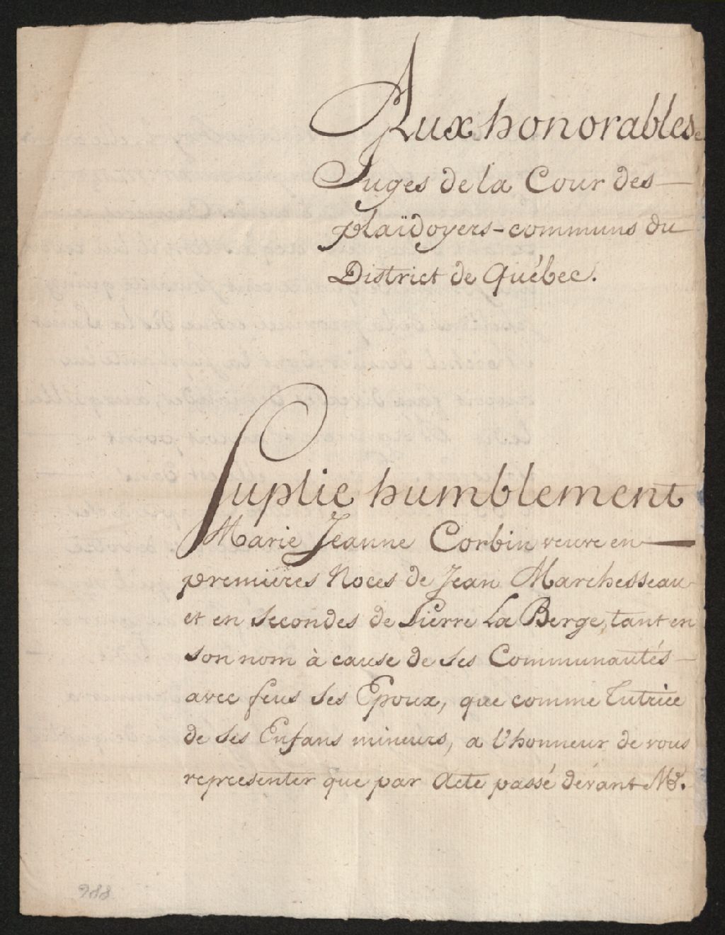 - Procès entre Marie-Jeanne Corbin, veuve en premières noces de Jean Marchesseau (Marchessault) et en secondes noces de Pierre Laberge, tant en son nom que comme étant en communauté avec ses feus époux et comme tutrice de ses enfants mineurs, d'une part, et Jean-Baptiste Migneron, maître maçon de Québec, d'autre part, à propos de la somme de 475 shillings en argent courant pour le paiement d'un emplacement sis rue des Carrières à Québec, en vertu d'un acte de vente passé devant maître Lamorille, notaire royal