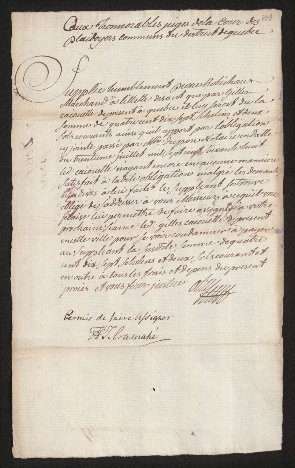 Procès entre Pierre Robichaux (Robichaud), marchand à l'Islet, d'une part, et Gilles Caiouette (Caouette), anciennement du Cap-Saint-Ignace et de présent à Québec, d'autre part, à propos de la somme de 417 shillings et 2 sols en argent courant contenue dans une obligation du 30 juillet 1768 passée devant maître Dupont, notaire