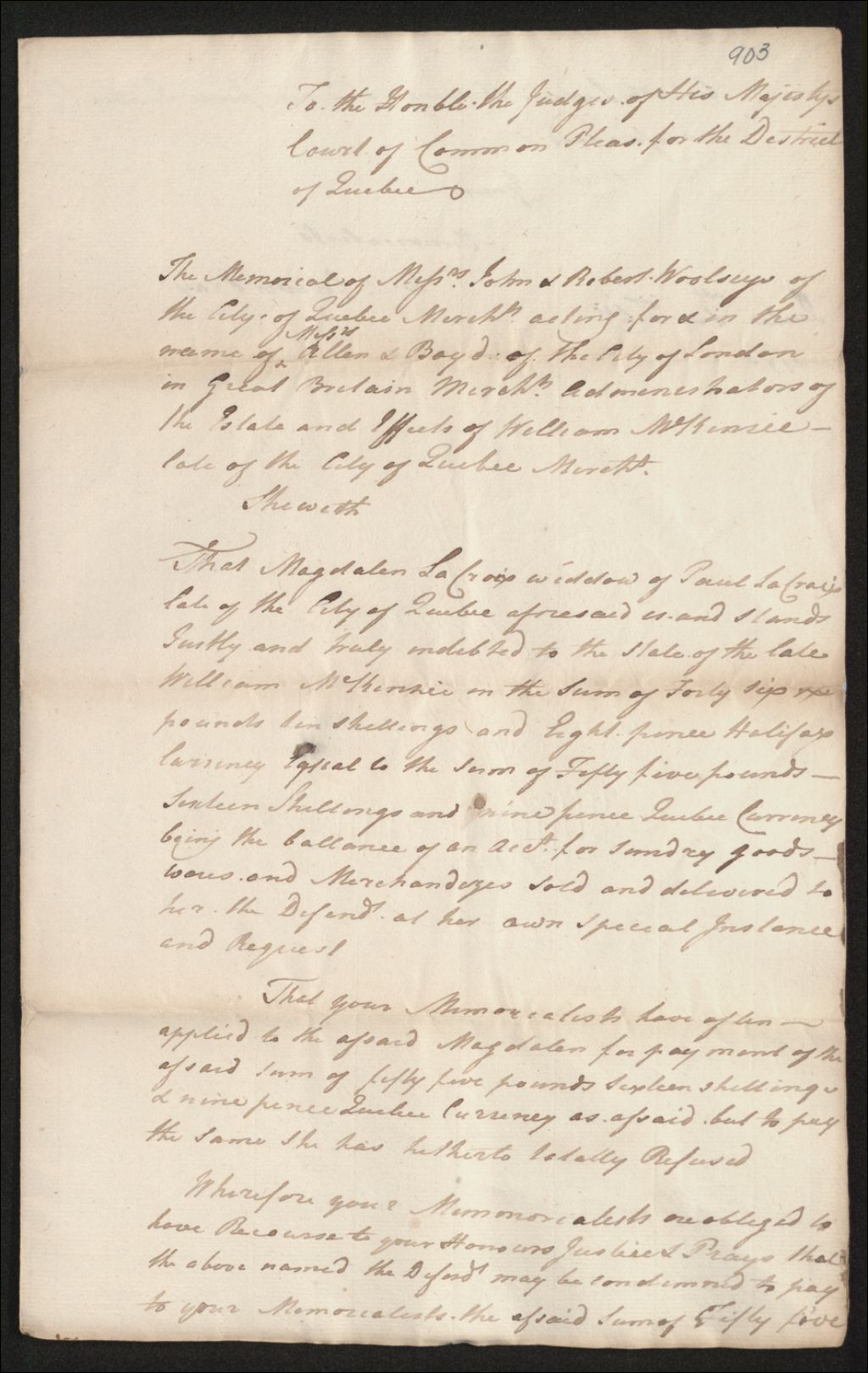 Procès entre John Woolsey et Robert Woolsey, marchands de Québec, agissant pour et au nom des sieurs Allen et Boyd, marchands de Londres en Grande-Bretagne, administrateurs de la succession et des effets de feu William McKenzie (MacKenzie), vivant marchand de Québec, d'une part, et Madeleine Lacroix, veuve de Paul Lacroix, demeurant à Québec, d'autre part, à propos de la somme de 46 livres, 6 shillings et 8 sols en argent d'Halifax, équivalente à celle de 45 livres, 16 shillings et 9 sols en argent courant, pour la balance d'un compte de marchandises vendues et livrées