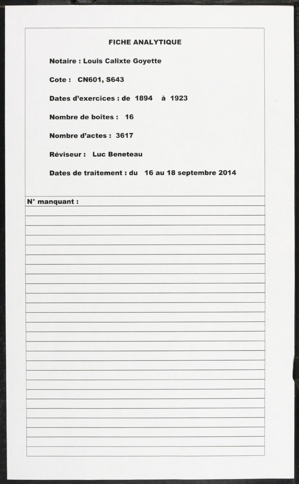 Louis Calixte Goyette, 1894-1923, Archives nationales à Montréal, Fonds Cour supérieure. District judiciaire de Montréal. Greffes de notaires, (06M,CN601,S643).