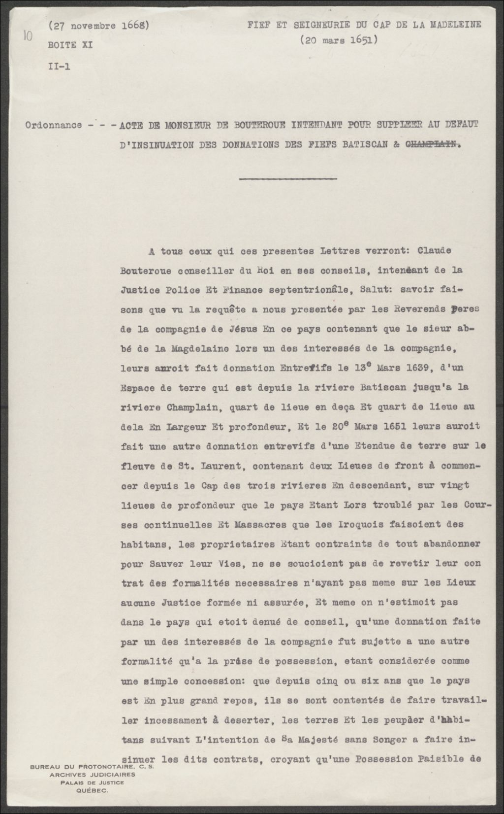 Ordonnance de Claude Bouteroue, intendant de la Nouvelle-France., Copie dactylographiée en [19-] original créé le 27 novembre 1668, Archives nationales à Québec, Collection Seigneuries, (03Q,P240,D48,P10).