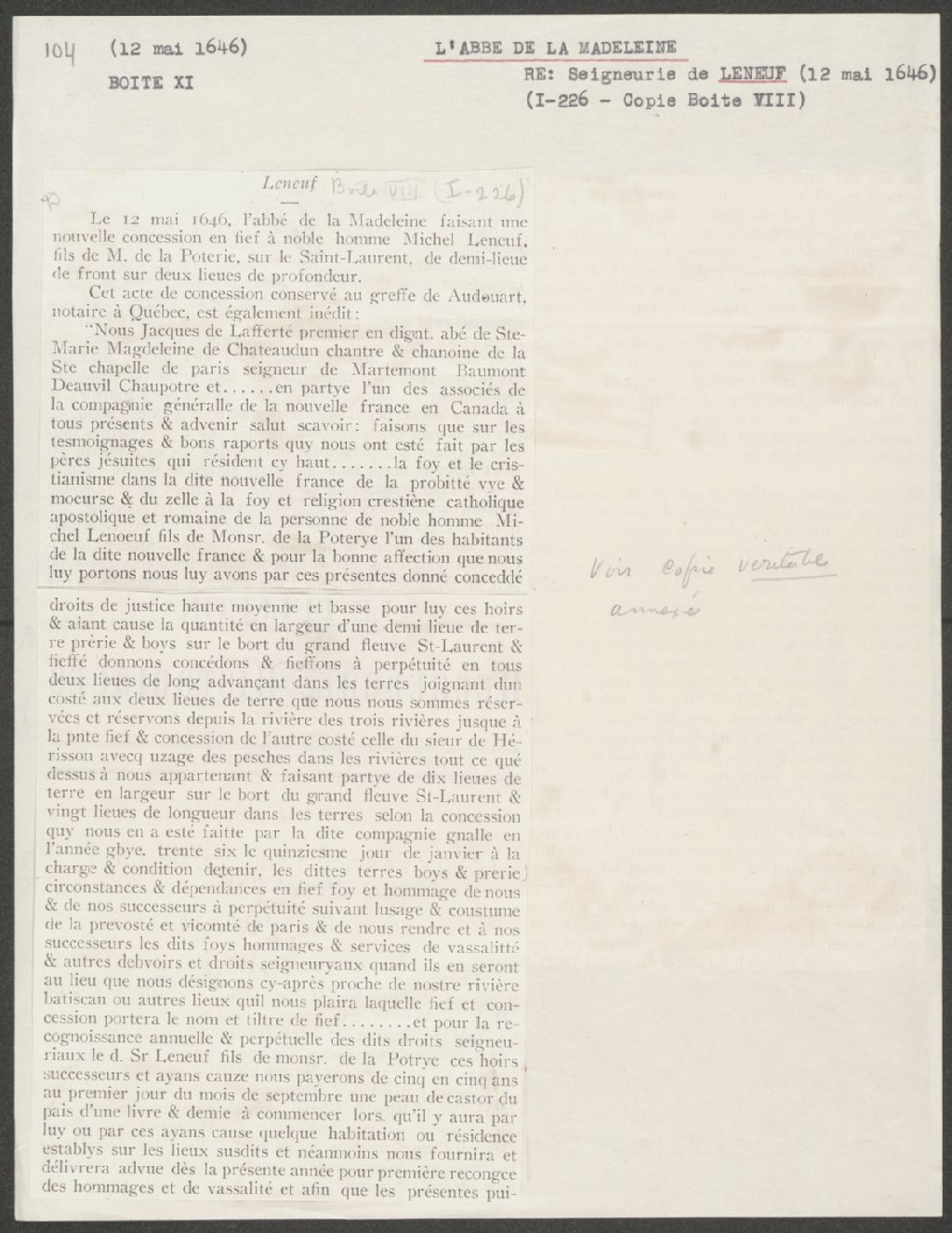 Documents de travail : Fief de Leneuf, sans date. Extrait du Bulletin des recherches historiques (BRH), [19-?], Archives nationales à Québec, Collection Seigneuries, (03Q,P240,D48,P104).