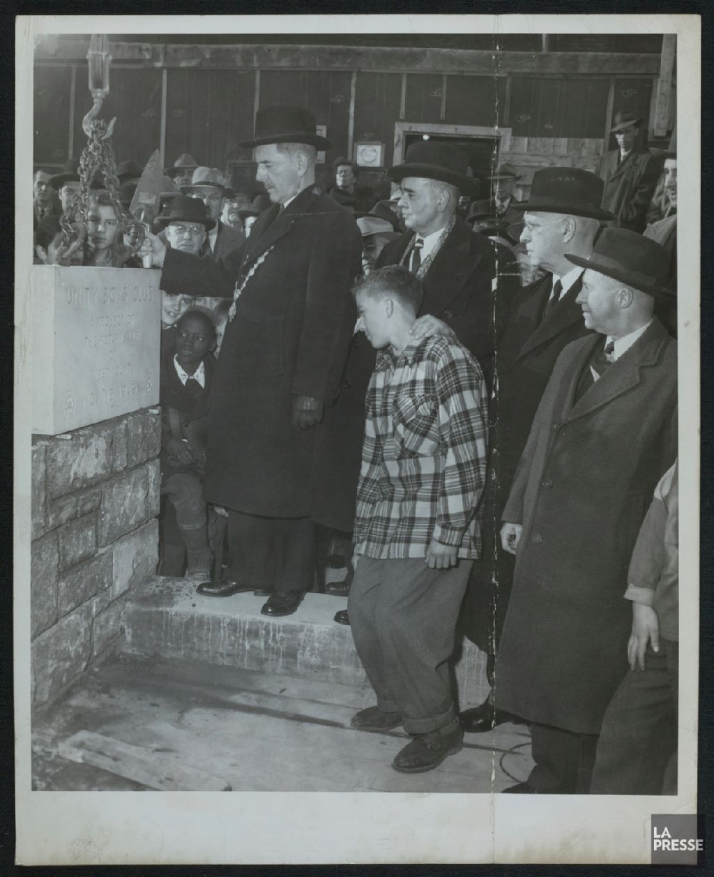 - Le dossier illustre le maire J.S. Cameron lors d'une cérémonie de la pose de la pierre angulaire du futur Unity Boy's Club. Des documents montrent aussi un abribus sur la rue Sherbrooke