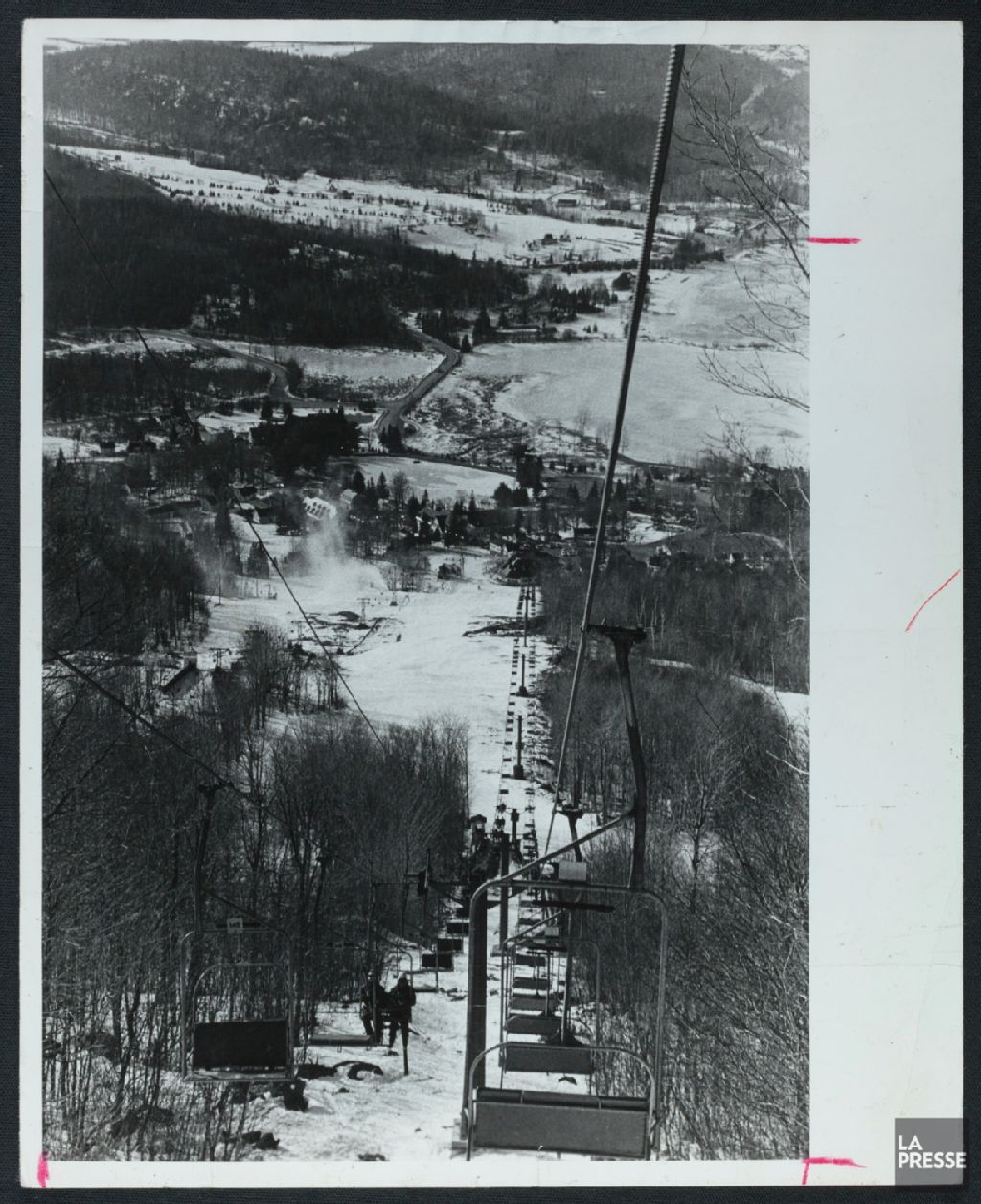 - Le dossier illustre notamment des skieurs dans le télésiège, un développement immobilier dans les années 1970 en bordure des pistes et les maisonnettes du Mont-Tremblant Lodge au pied des pistes