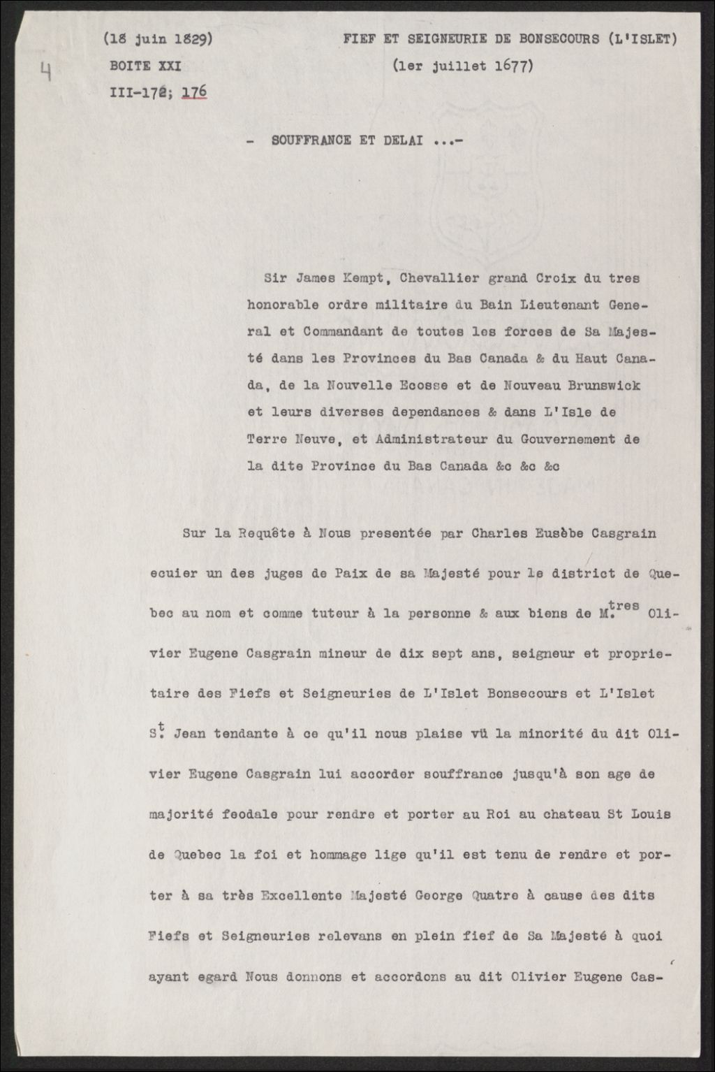 Souffrance de foi et hommage impliquant Charles-Eusèbe Casgrain et Olivier Eugène Casgrain., Copie dactylographiée en [19-] (original créé le 18 juin 1829), Archives nationales à Québec, Collection Seigneuries, (03Q,P240,D38,P4).