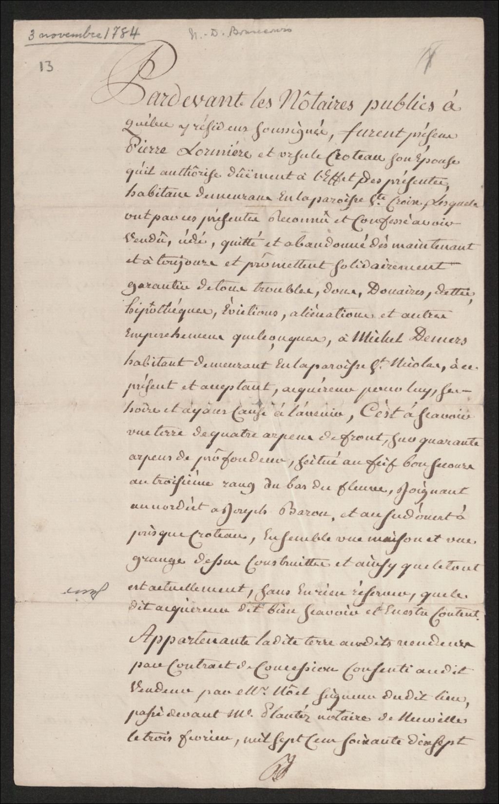 - Vente de terre par Pierre Lormière à Michel Demers.