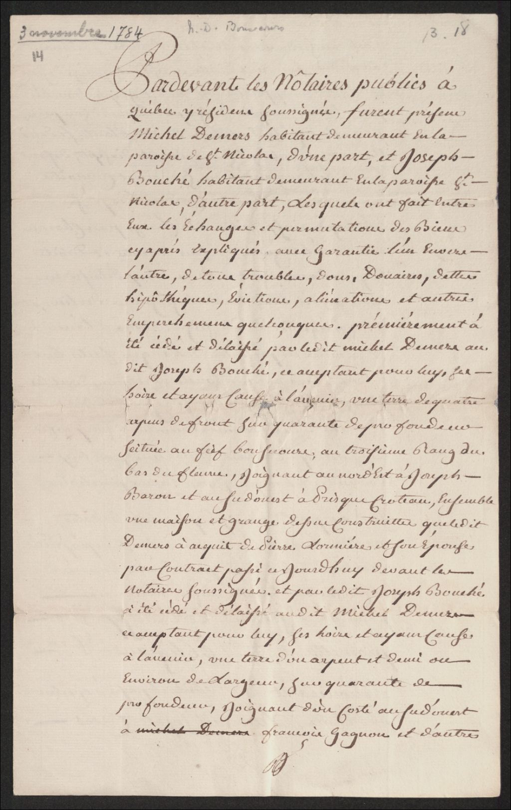 Échange entre Michel Demers et Joseph Bouché (Boucher)., 3 novembre 1784, Archives nationales à Québec, Collection Seigneuries, (03Q,P240,D39,P14).