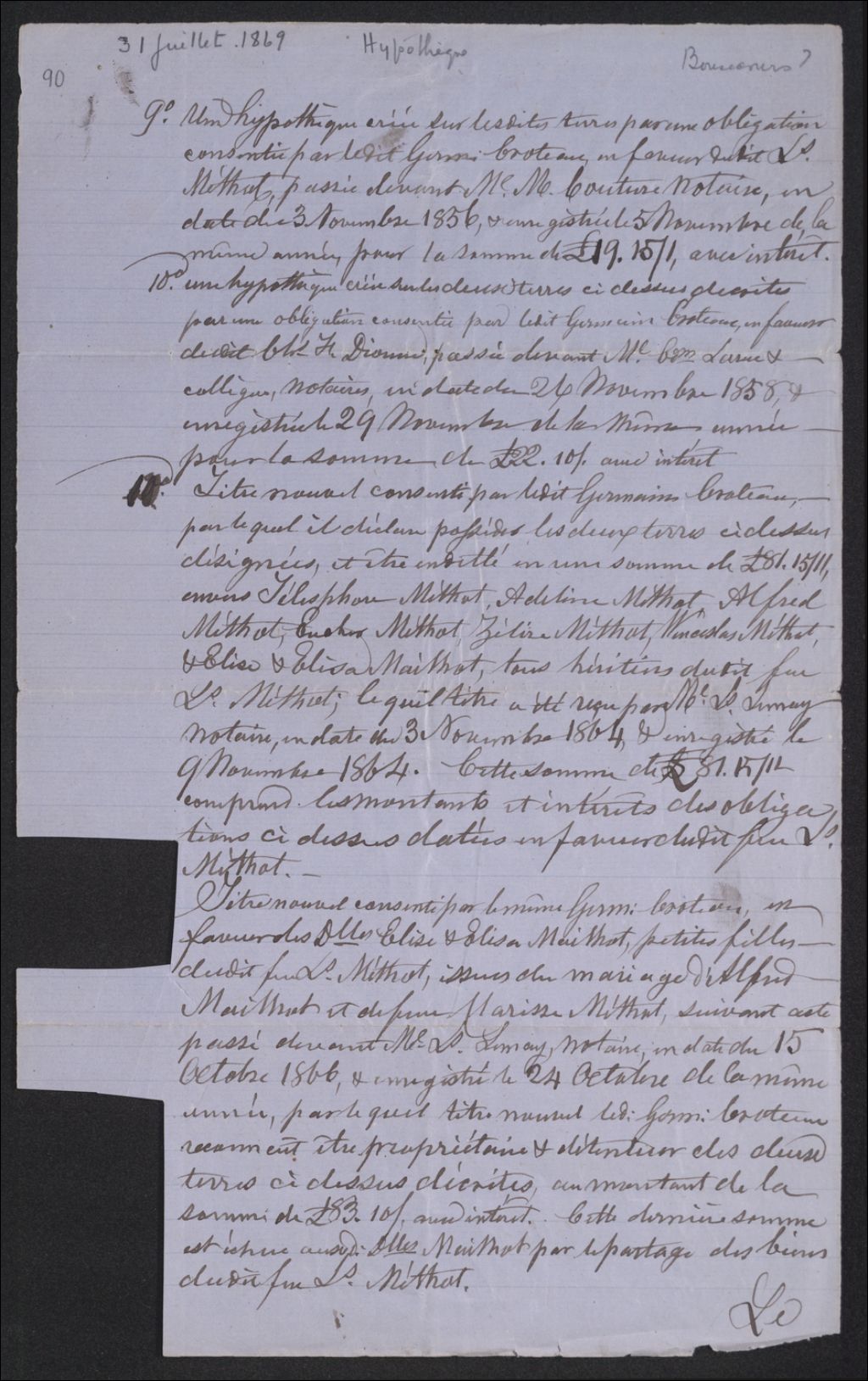 Certificat des hypothèques sur les terres de Germain Croteau., 31 juillet 1869, Archives nationales à Québec, Collection Seigneuries, (03Q,P240,D39,P90).