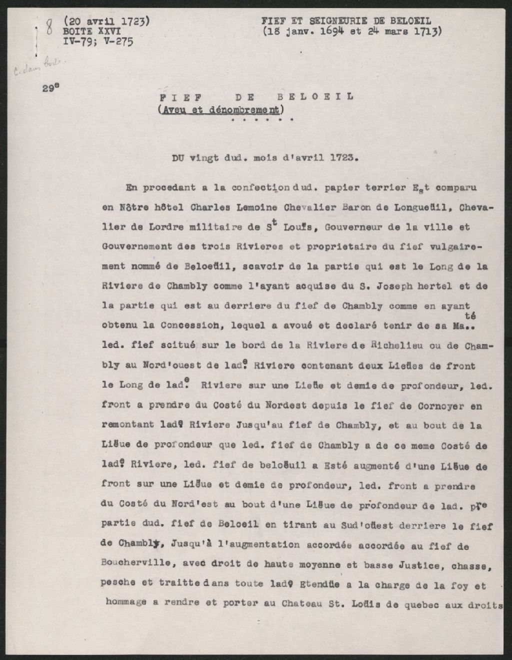 Aveu et dénombrement de Charles Lemoyne, baron de Longueil, chevalier de Saint-Louis, gouverneur des Trois-Rivières, pour le fief de Beloeil., Copie dactylographiée en [19-] (original créé le 20 avril 1723), Archives nationales à Québec, Collection Seigneuries, (03Q,P240,D30,P8).