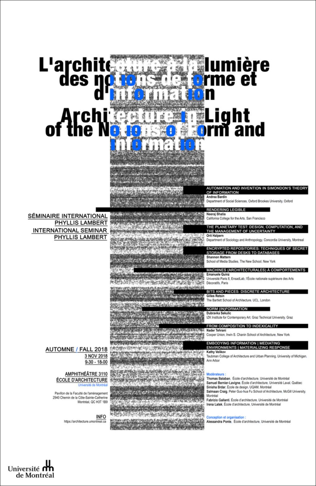 L'architecture à la lumière des notions de forme et d'information = Architecture in light of the notions of form and information, séminaire international Phyllis Lambert, automne 2018, 3 nov. 2018..., Amphithéâtre 3110, École d'architecture, Université de Montréal...