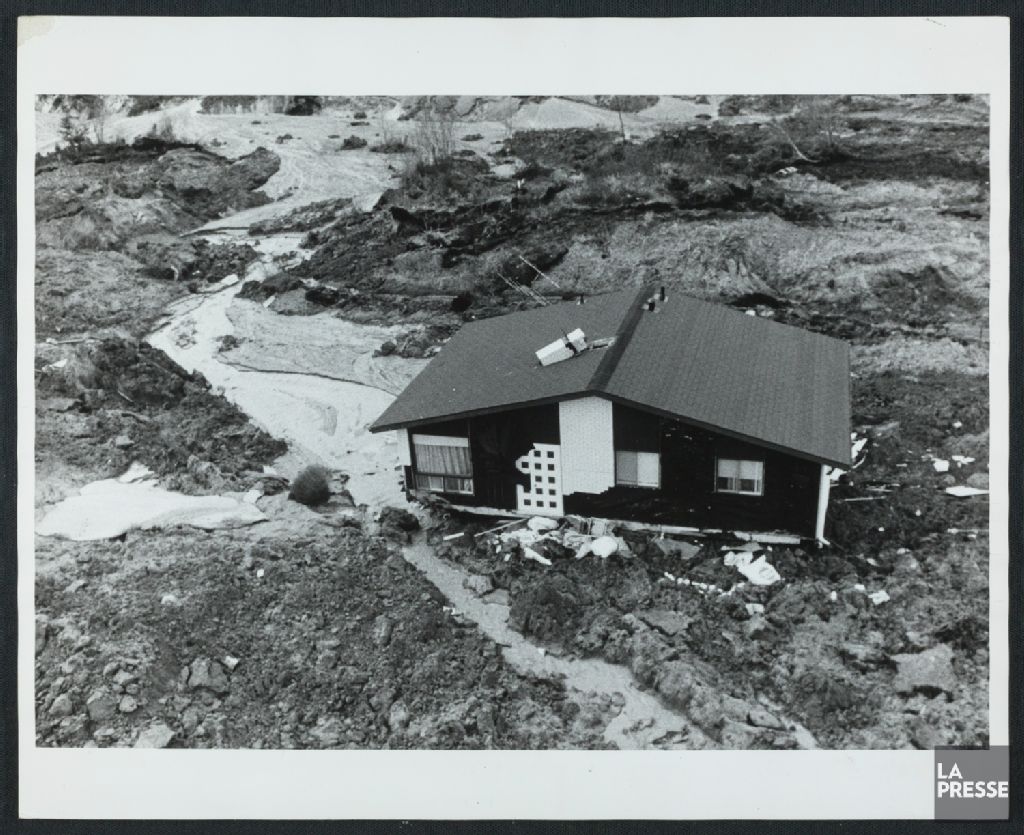 - Les photographies illustrent le glissement survenu sur le terrain portant le nom de « Terres rompues » et le débordement de la « rivière aux Vases »
