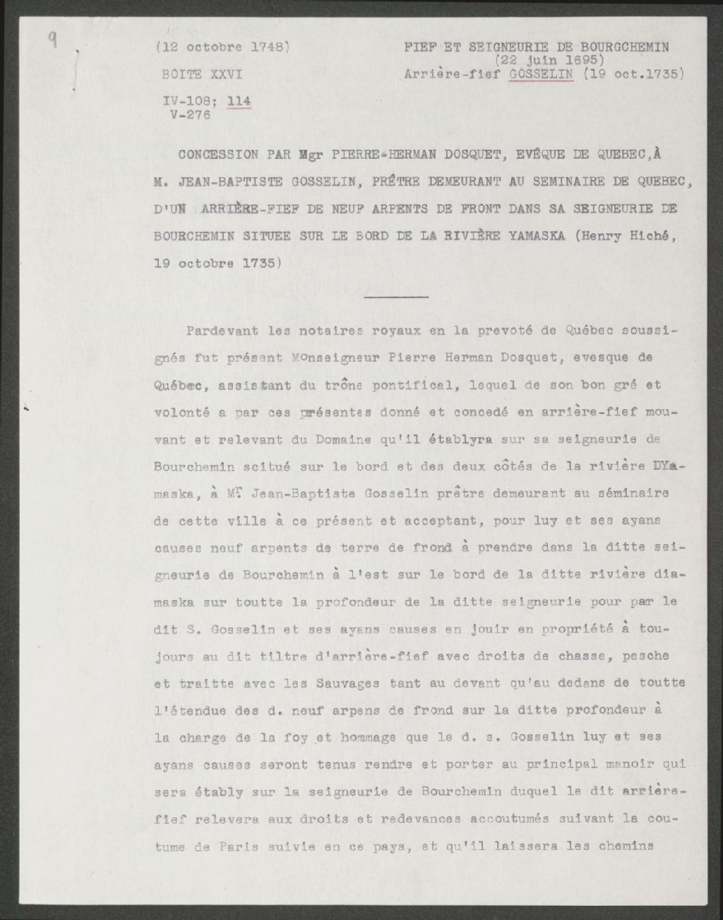 Acte de concession de Mgr Pierre-Herman Dosquet, évêque de Québec, à messire Jean-Baptiste Gosselin, prêtre, demeurant au séminaire de Québec., Copie dactylographiée en [19-] (original créé le 19 octobre 1735), Archives nationales à Québec, Collection Seigneuries, (03Q,P240,D42,P9).