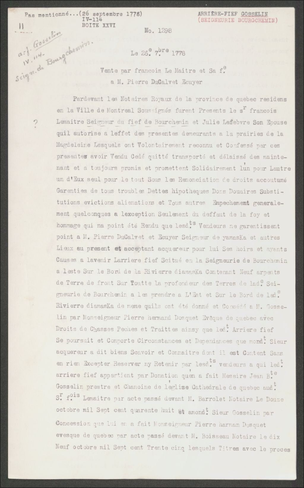 - Copie dactylographiée en [19-] (original créé le 26 sept. 1778)