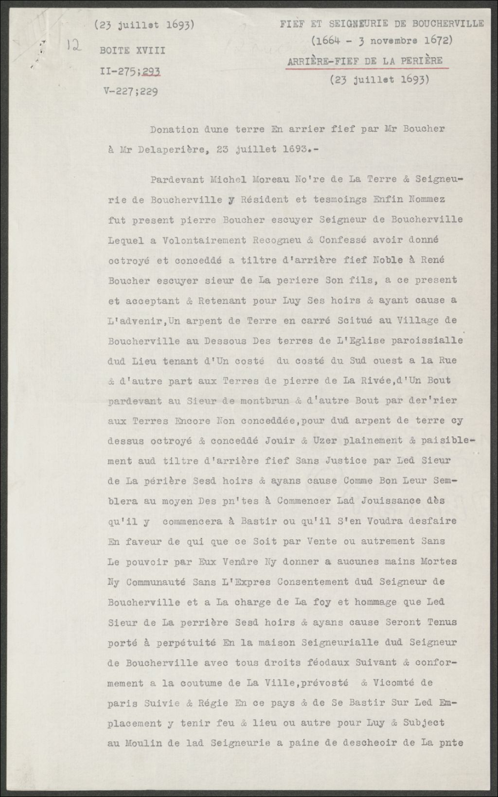Donation d'une terre en arrière-fief par Pierre Boucher à René Boucher de la Perrière., Copie dactylographiée de [19-] (original créé le 23 juillet 1693), Archives nationales à Québec, Collection Seigneuries, (03Q,P240,D46,P12).