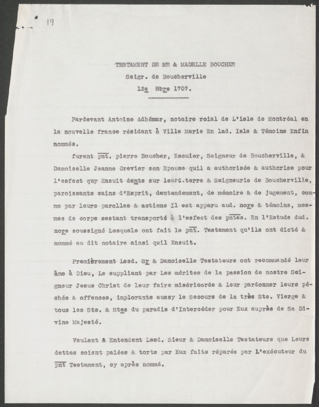 - Testament de Pierre Boucher, seigneur de Boucherville, et Jeanne Crevier.