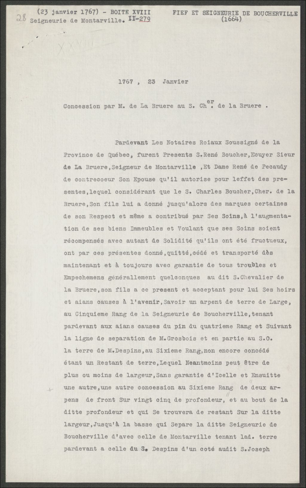 Concession par René Boucher de la Bruère à Charles Boucher de la Bruère., Copie dactylographiée en [19-] (original créé le 23 janvier 1767), Archives nationales à Québec, Collection Seigneuries, (03Q,P240,D46,P28).