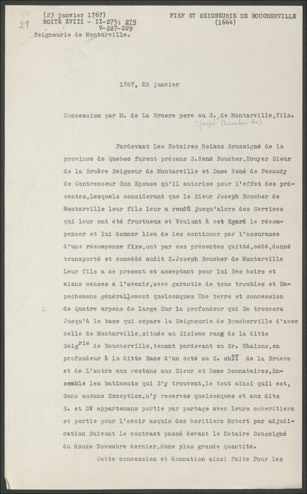 Concession par René Boucher de la Bruère à Joseph Boucher de Montarville., Copie dactylographiée en [19-] (original créé le 23 janvier 1767), Archives nationales à Québec, Collection Seigneuries, (03Q,P240,D46,P29).