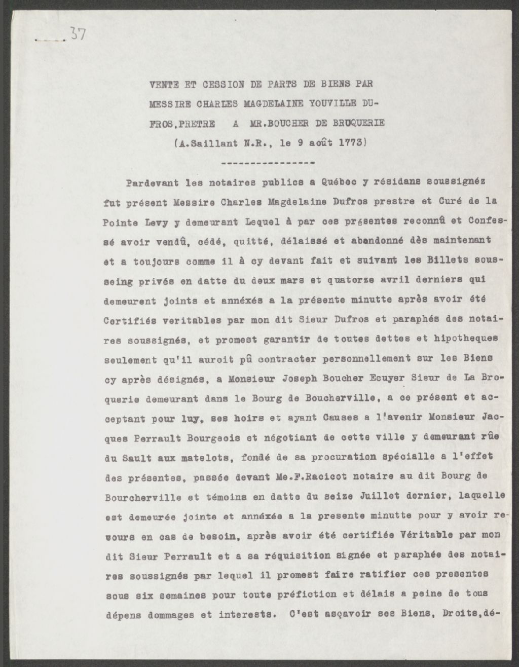 - Vente et cession de parts de bien par Charles-Magdelaine Youville Dufrois à Joseph Boucher de la Broquerie.