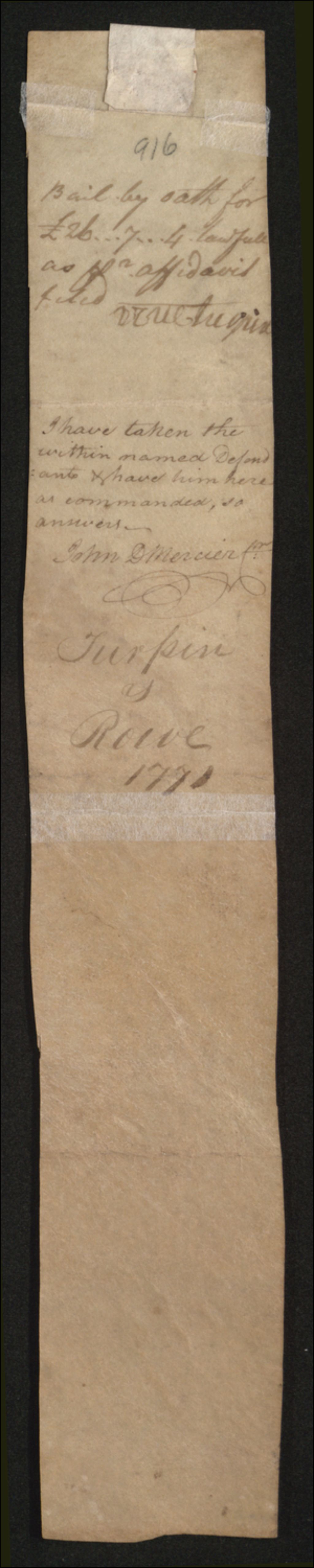 - Litige entre Marie Josephte Bailly, veuve Turpin, bourgeoise de cette ville, d'une part, et sieur Jacob Rowe, député prevost maréchal, d'autre part, à propos de la somme de 30 livres en argent courant de la province de Québec, pour la location d'une maison située sur la rue des Jardins dans la haute ville de Québec
