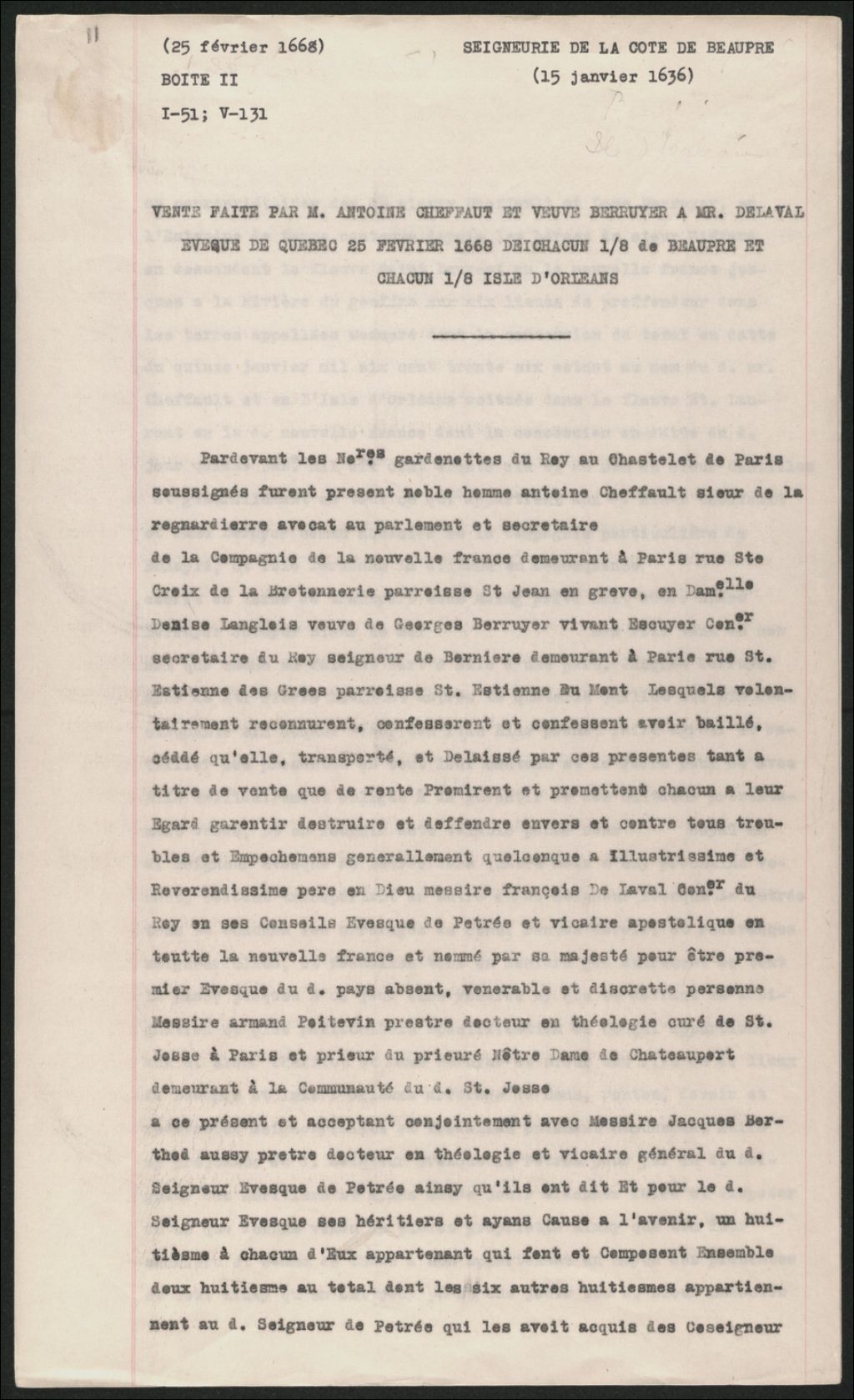 - Le titre complet de la pièce se lit comme suit : Acte de vente de noble homme Antoine Cheffault, avocat en Parlement et secrétaire des Mrs de la Nouvelle-France, et de damoiselle Denise Langlois, veuve de Georges Berruyer Bonnefault, ès noms qu'ils agissent, à Mgr de Laval : Vente de chacun 1/8 de Beaupré et 1/8 d'Orléans