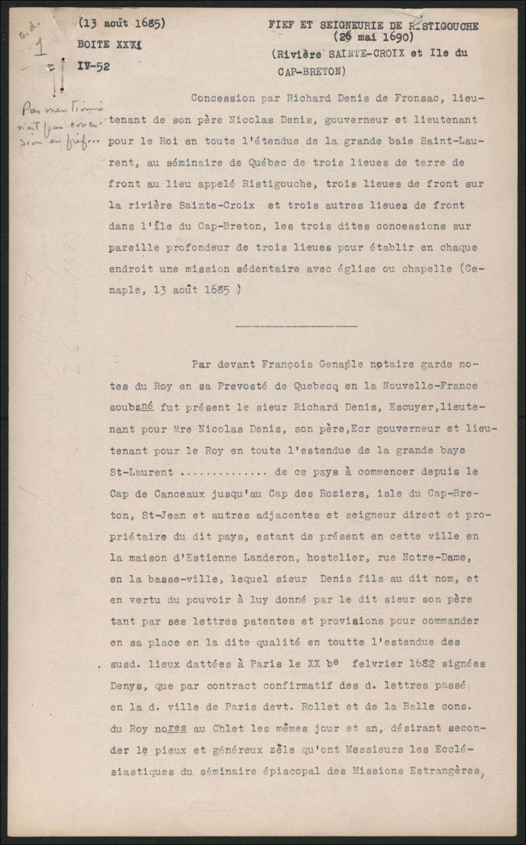 Concession par Richard Denis de Fronsac au séminaire de Québec : Seigneuries Ristigouche, Rivière Sainte-Croix et Île du Cap-Breton, Copie dactylographiée en [19-] (original créé le 13 août 1685), Archives nationales à Québec, Collection Seigneuries, (03Q,P240,D3,P1).