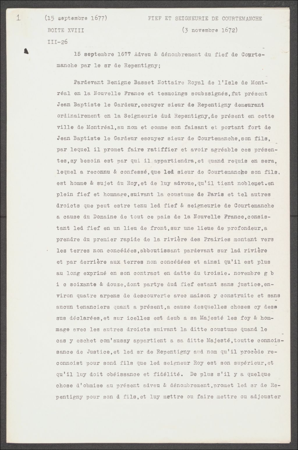 - Le titre complet de la pièce se lit comme suit : Aveu et dénombrement de Jean-Baptiste Le Gardeur de Repentigny, au nom et se faisant fort de Jean-Baptiste Le Gardeur de Courtemanche son fils, pour le fief de Courtemanche, consistant en une lieue de front sur une lieue de profondeur, à prendre du premier rapide de la rivière des Prairies montant vers les terres non concédées, aboutissant par devant la dite rivière et par derrière aux terres non concédées.