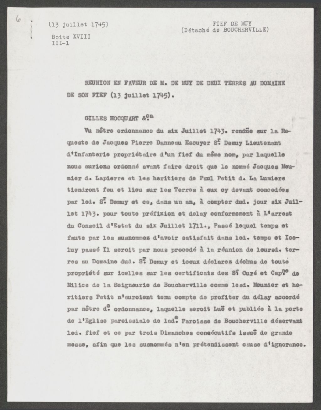 - Le titre complet de la pièce se lit comme suit : Ordonnance de Gilles Hocquart, intendant de la Nouvelle-France, qui réunit au domaine de Jacques-Pierre Daneu de Muy, lieutenant d'infanterie, propriétaire du fief de Muy, les terres de Jacques Meunier dit Lapierre et des héritiers de Paul Petit dit Lalumière, qui ne tiennent pas feu et lieu et n'ont pas mis leurs dites terres en valeur.
