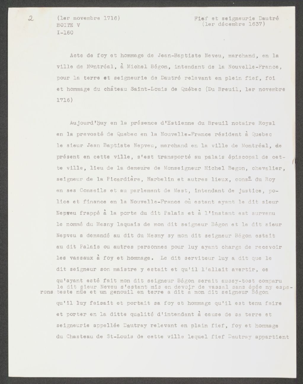 Acte de foi et hommage de Jean-Baptiste Neveu, marchand, de la ville de Montréal, pour la terre et seigneurie de Dautré, relevant en plein fief, foi et hommage du château Saint-Louis de Québec., Copie dactylographiée en [19-] (original créé le 1 novembre 1716), Archives nationales à Québec, Collection Seigneuries, (03Q,P240,D70,P2).
