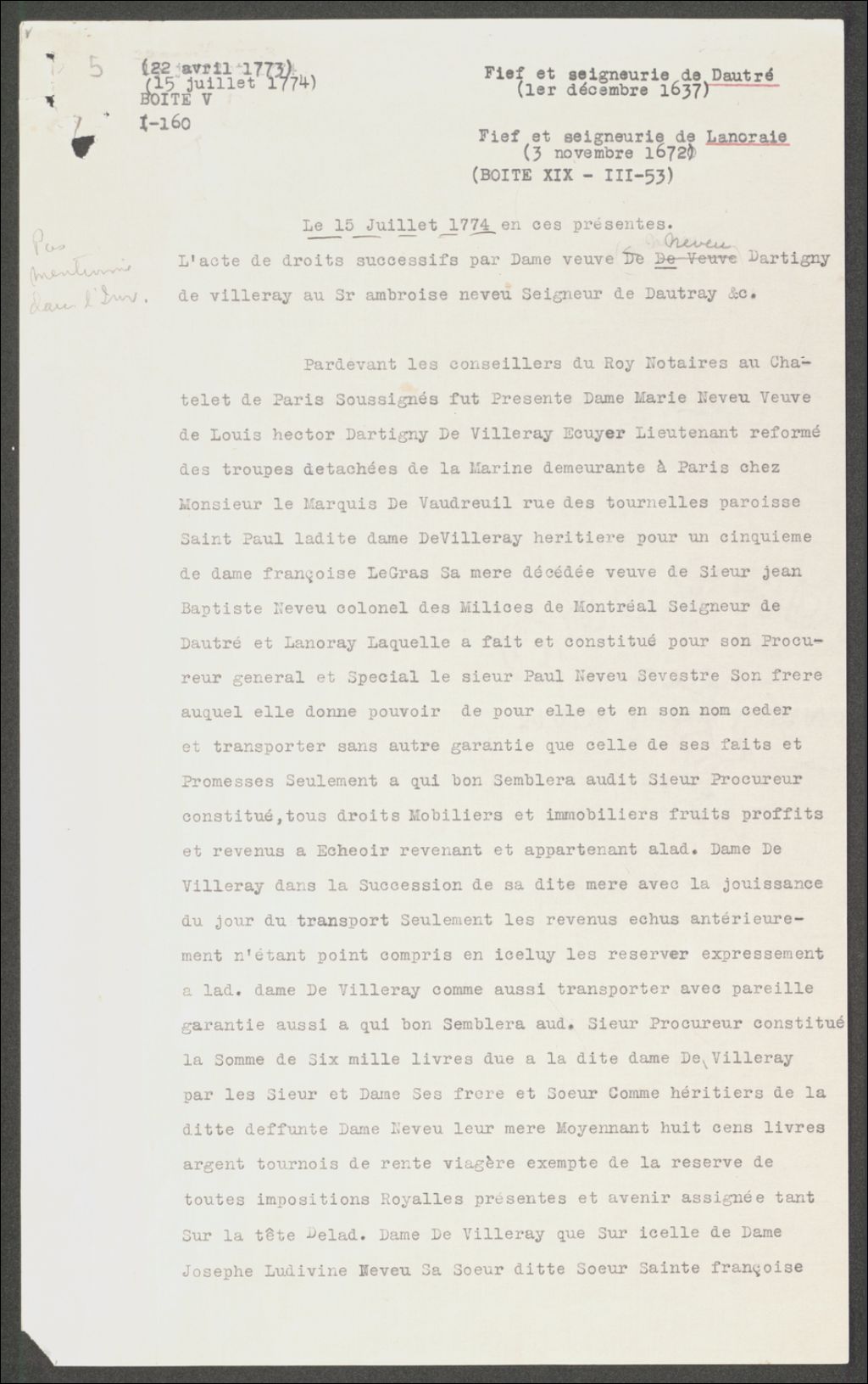 Procuration impliquant Marie Neveu, veuve D'Artigny et Paul Neveu., Copie dactylographiée en [19-] (original créé le 22 avril 1773), Archives nationales à Québec, Collection Seigneuries, (03Q,P240,D70,P5).