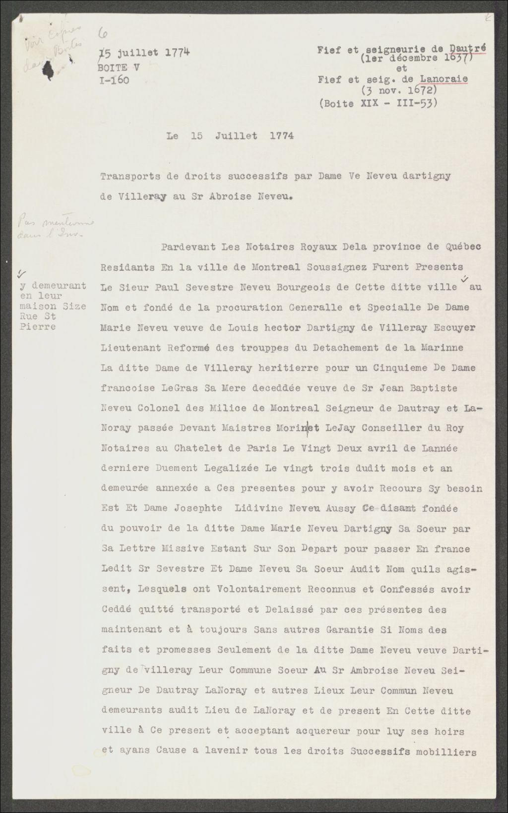 - Transport de droits successifs par Marie Neveu, veuve D'Artigny, à Ambroise Neveu.