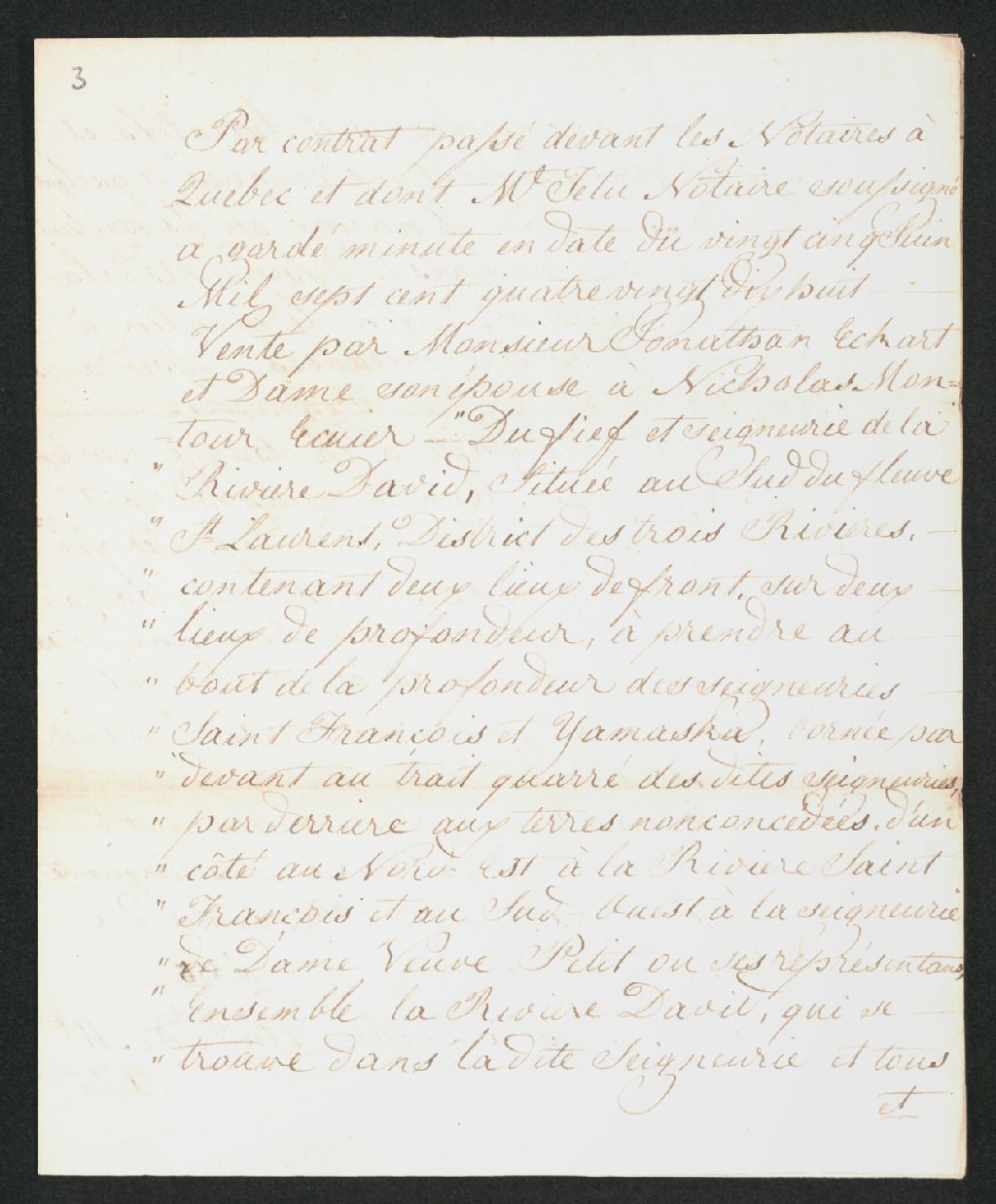 Vente du fief et seigneurie de la Rivière David par Jonathan Eckart à Nicolas Montour., 25 juin 1798, Archives nationales à Québec, Collection Seigneuries, (03Q,P240,D72,P3).