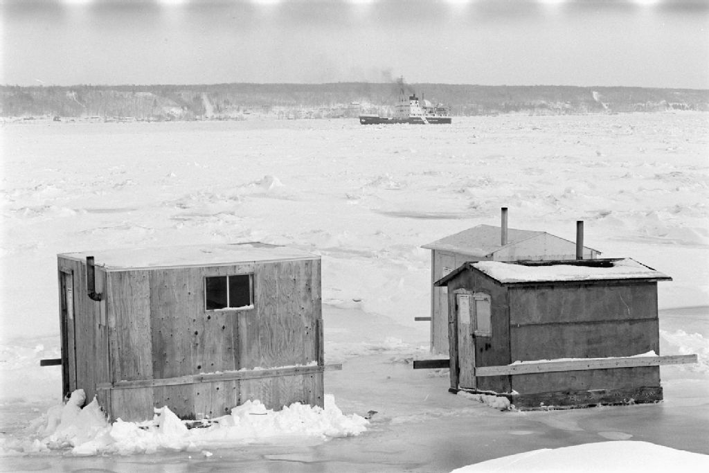 Cabanes pour la pêche sur le Saint-Laurent dans le comté de Portneuf, brise-glace et vieux presbytère de Deschambault