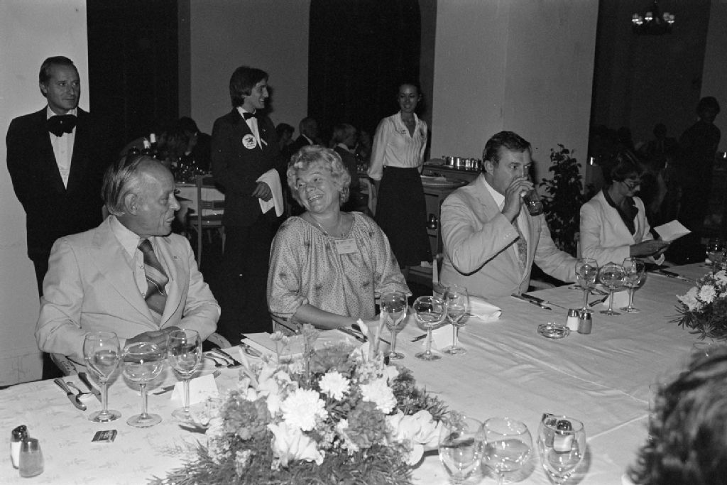Rencontre des premiers ministres du Canada au manoir Richelieu ; dîner officiel, remerciements du premier ministre René Lévesque et remise d'une sérigraphie à chaque premier ministre, 1979-08, Archives nationales à Québec, Fonds Ministère des Communications, (03Q,E10,S44,SS1,D79-739), Marc Lajoie.