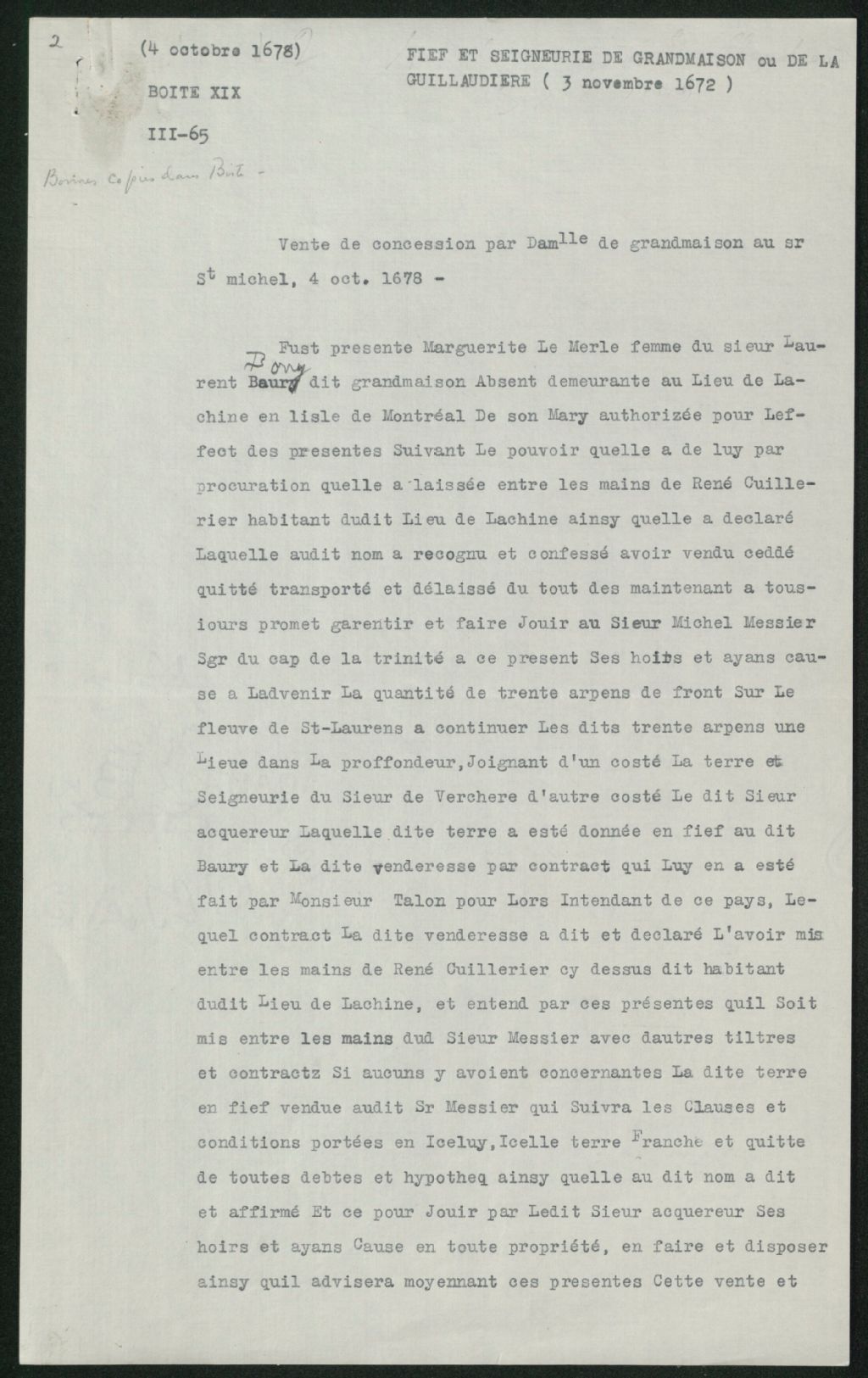 - Le titre complet de la pièce se lit comme suit : Acte de vente de Marguerite Le Merle, femme de Laurent Borry dit Grandmaison, absent, à Michel Messier, seigneur du Cap-de-la-Trinité, de "la quantité de trente arpents de front sur le fleuve de St-Laurent à continuer les dits trente arpents une lieue dans la profondeur, joignant d'un côté la seigneurie du sieur de Verchères, d'autre côté le dit acquéreur, laquelle terre a été donnée en fief au dit Borry et la dite venderesse par contrat qui lui en a été fait par M. Talon, lors intendant de ce pays".