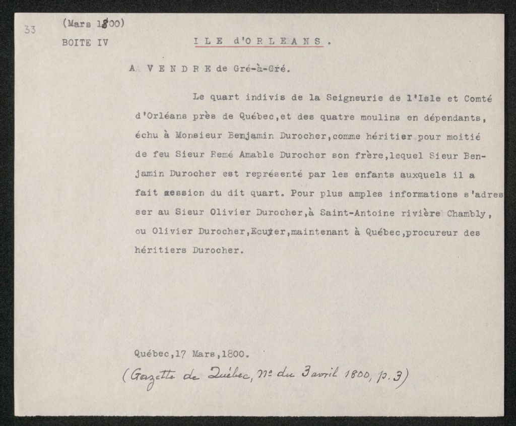 Annonce concernant la vente du quart indivis de la seigneurie de l'île et comté d'Orléans et des quatre moulins en dépendants, échu à Benjamin Durocher, comme héritier pour moitié de feu sieur René-Amable Durocher, son frère. Extrait de la Gazette de Québec., Copie dactylographiée en [19-] (original créé le 3 avril 1800), Archives nationales à Québec, Collection Seigneuries, (03Q,P240,D148,P33).