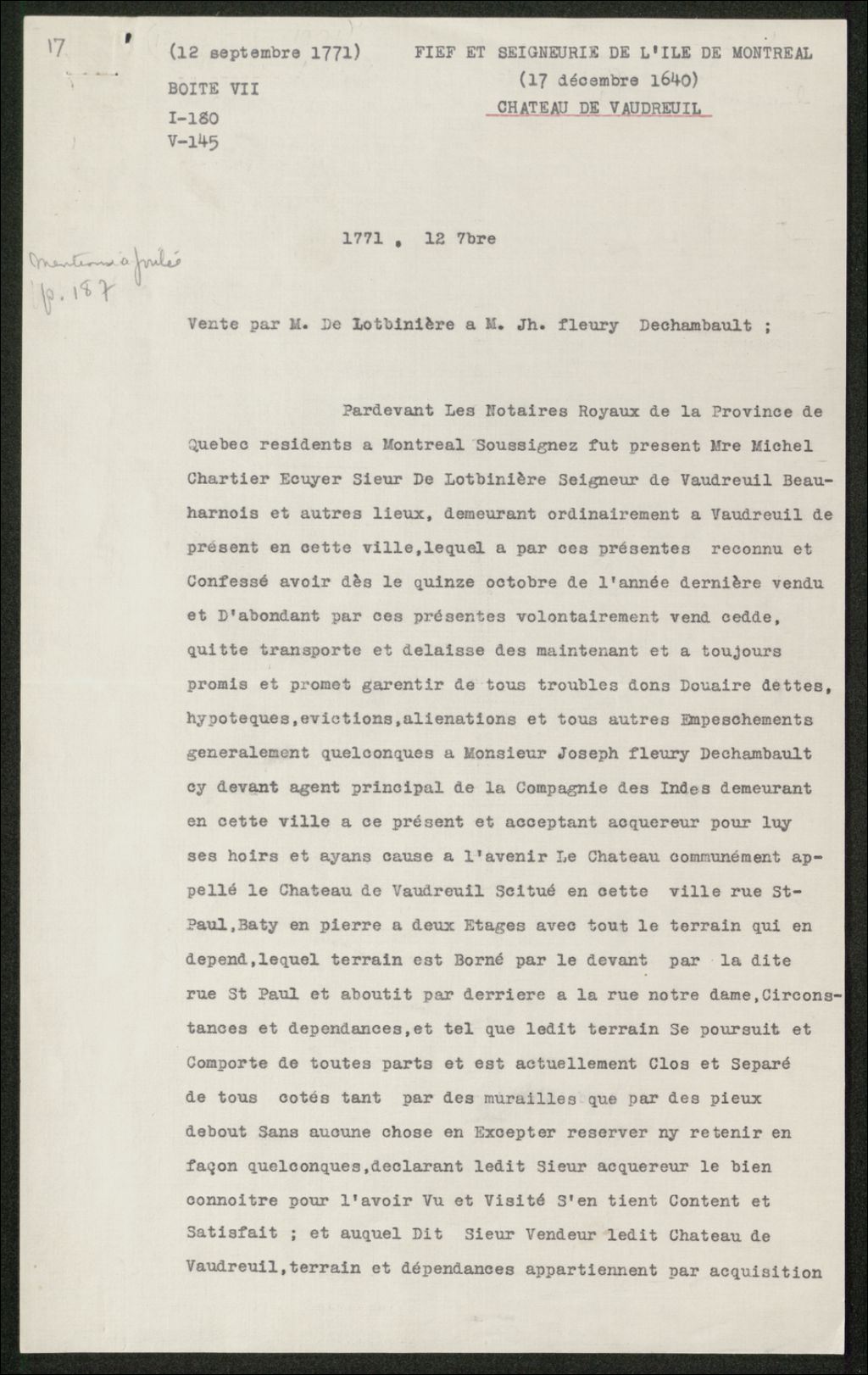 Vente par Michel Chartier de Lotbinière à Joseph Fleury Dechambault., Copie dactylographiée en [19-] original créé le 12 septembre 1771, Archives nationales à Québec, Collection Seigneuries, (03Q,P240,D119,P17).