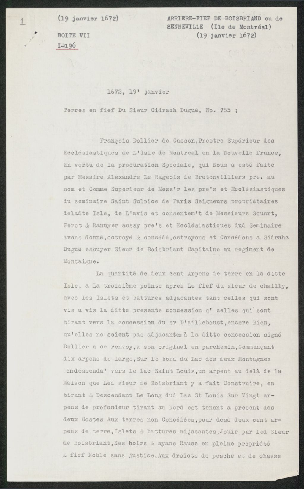 Concession par François Dollier de Casson, supérieur des Ecclésiastiques de l'Île de Montréal, à Sidrach Dugué sieur de Boisbriand., Copie dactylographiée en [19-] (original créé le 19 janvier 1672), Archives nationales à Québec, Collection Seigneuries, (03Q,P240,D122,P1).