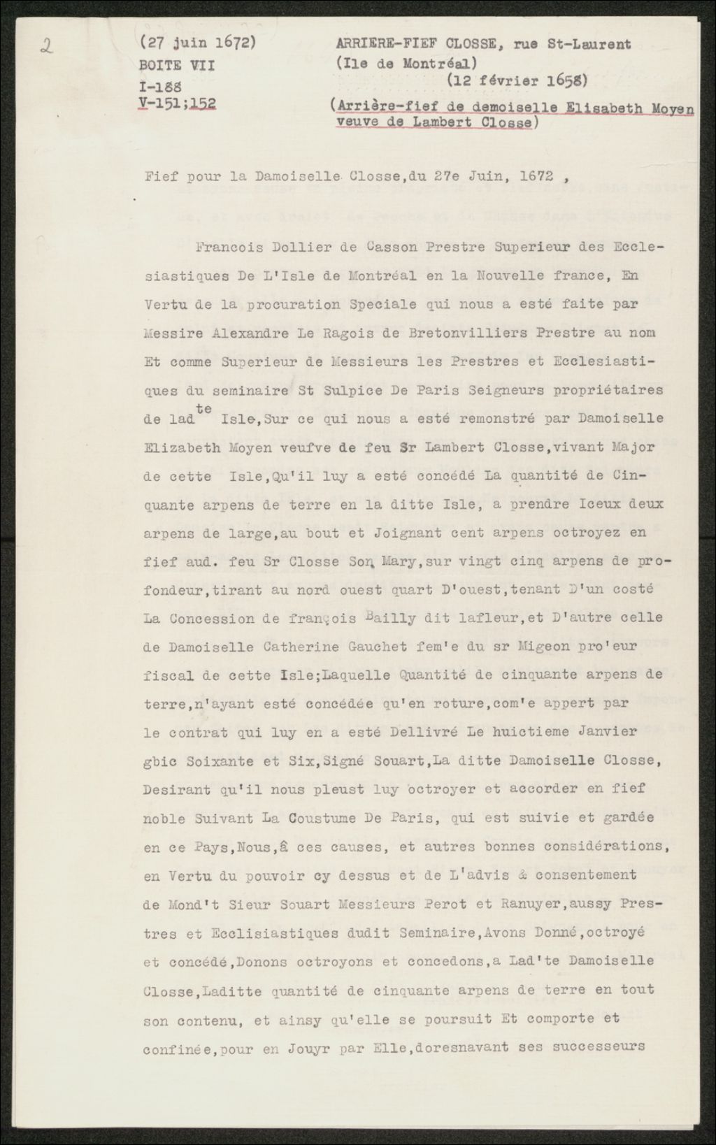 Concession à Elizabeth (sic) Moyen, veuve de Lambert Closse., Copie dactylographiée en [19-] (original créé le 27 juin 1672), Archives nationales à Québec, Collection Seigneuries, (03Q,P240,D125,P2).