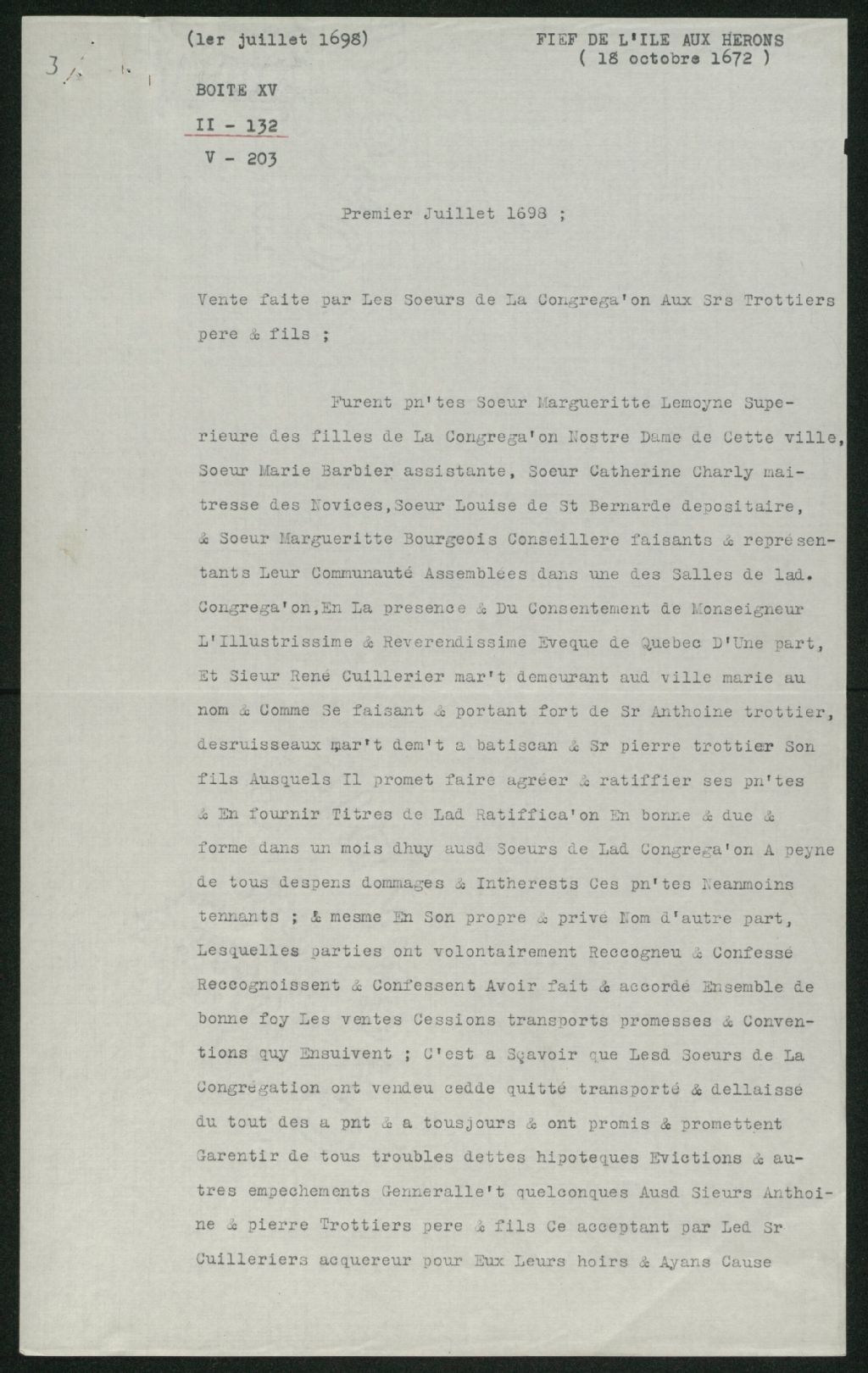 Acte de vente des Filles Séculières de la Congrégation Notre-Dame de Montréal à Antoine Trottier Desaunier Desruisseaux de la moitié de l'île aux Hérons et île adjacente., Copie dactylographiée en [19-] (original créé le 1 juillet 1698), Archives nationales à Québec, Collection Seigneuries, (03Q,P240,D114,P3).