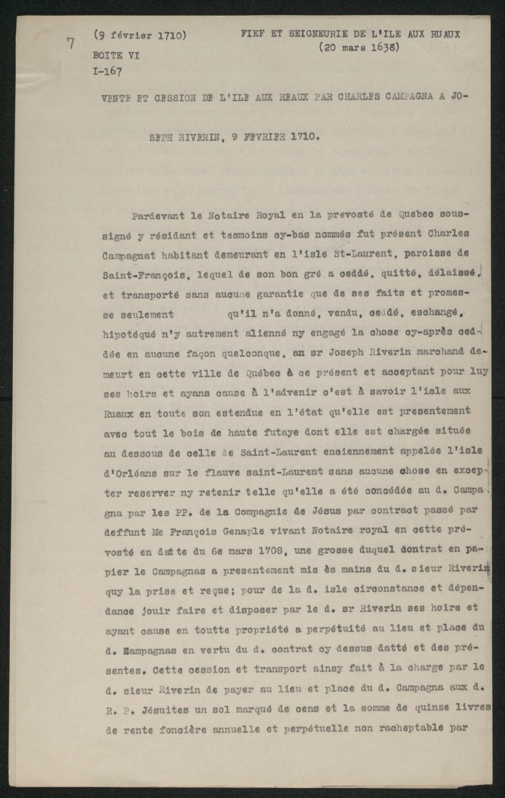 Acte de vente et cession de Charles Campagna, habitant, de l'île et comté Saint-Laurent, paroisse Saint-François, à Joseph Riverin, marchand, demeurant en la ville de Québec, de l'île aux Ruaux., Copie dactylographiée en [19-] (original créé le 9 février 1710), Archives nationales à Québec, Collection Seigneuries, (03Q,P240,D117,P7).
